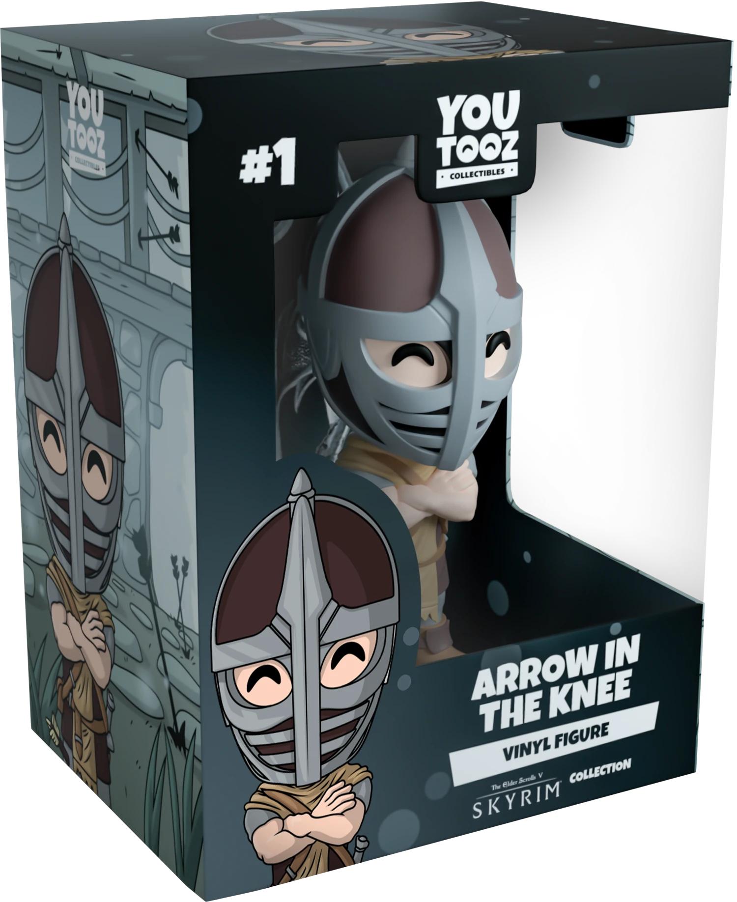 Skyrim has arrived to Youtooz! Standing at 5 inches, this adventurer seems to have gotten into a little accident. He doesn’t seem too bothered by it though. He is dressed in a metal helmet with some leather underneath. He is posed in a stern and confident posture, with his arms crossed tightly across his chest. He wears neutral toned clothing with a light brown fabric slung across his body. He is equipped with a small leather bag that hangs on his right hip. Also on his right side is the arrow that is seen going through his right knee. Attached on his left hip is his sword, in case he ever needs to use it. The exterior of his double-walled packaging is a frosty scenery of the town, with a handful of arrows stuck into the ground. The interior a black and white fading background with the Skyrim logo. This collectible ships in a matte, embossed, protective outer sleeve and a custom sized plastic protector for maximum protection during shipping.