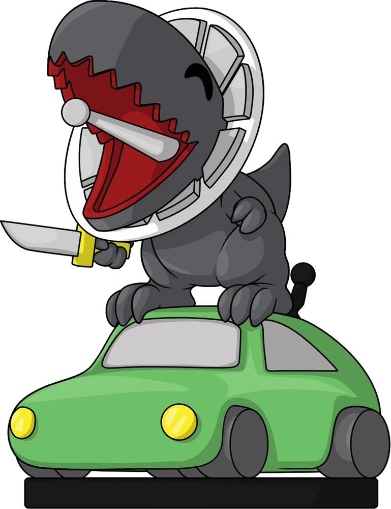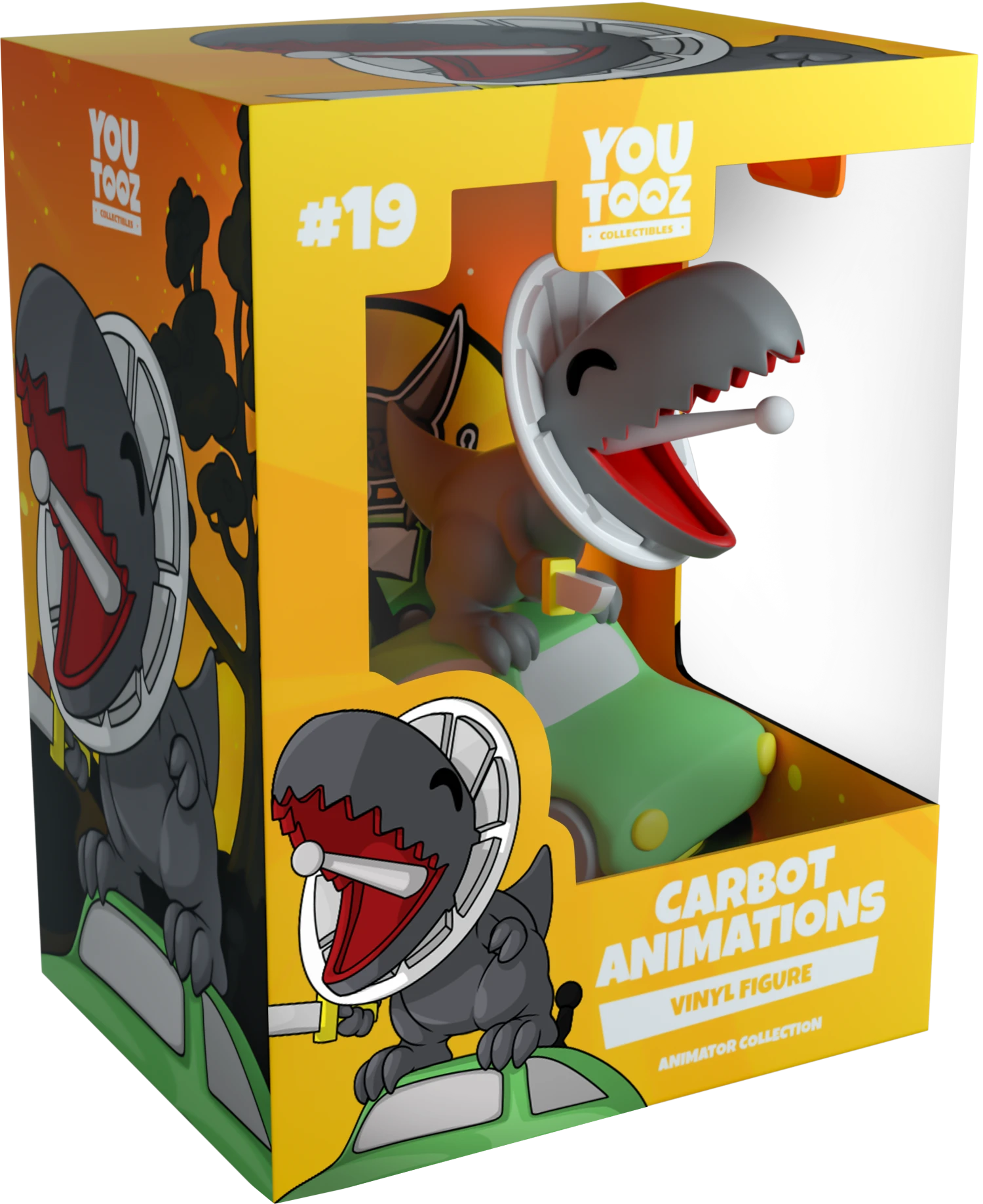 Standing at 4.5 inches, the Carbot Animations logo has come to life! The base is a neon green car with yellow headlights in the front and 4 gray wheels. On top of the car is a dark gray dinosaur with a satellite dish around its neck and the satellite line sticking out of the dino’s mouth. In the dino’s right hand is a sharp knife with a yellow base. The exterior of the double-walled packaging shows a warm-toned sky with hues of oranges and yellows and a small village with stone houses. The interior is a bright yellow and orange background that fades into each other. This figure was designed in collaboration with community member @therealracckun.This collectible ships in a matte, embossed, protective outer sleeve and a custom sized plastic protector for maximum protection during shipping.