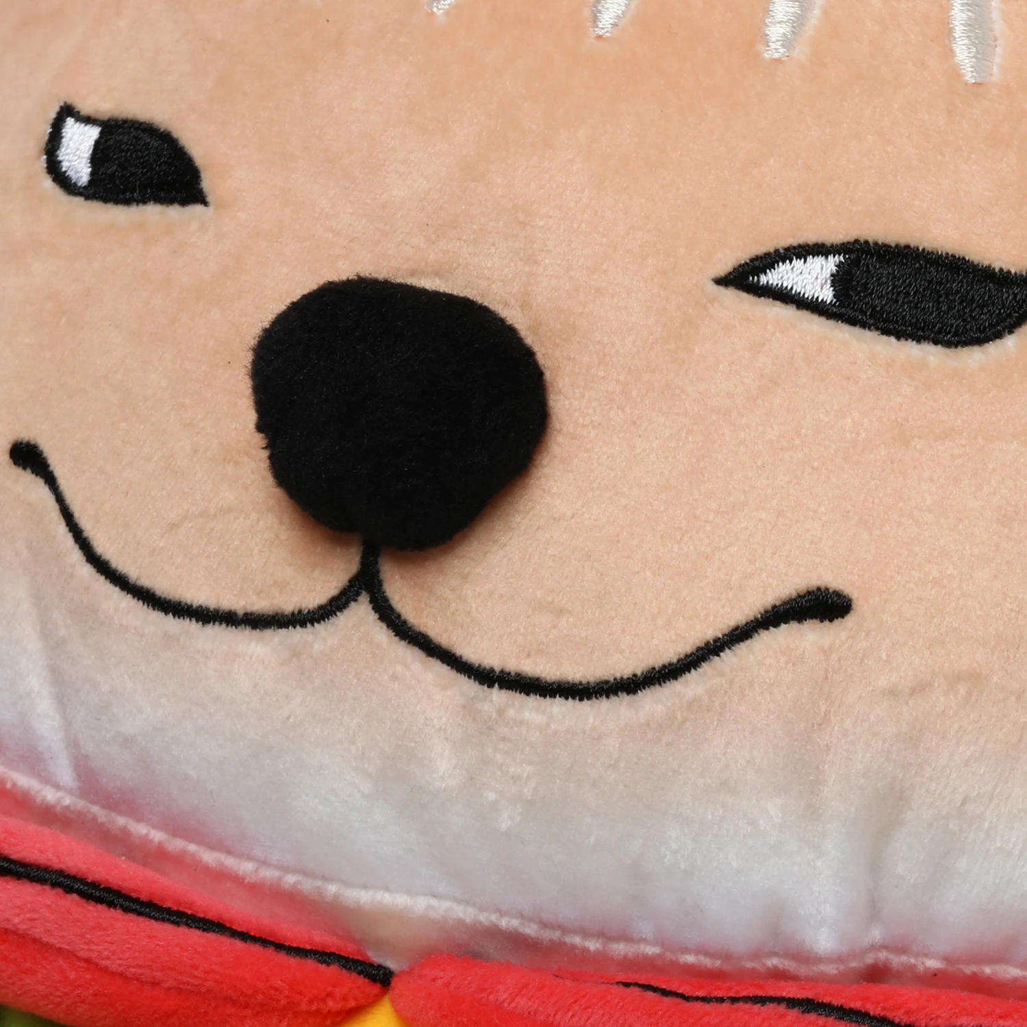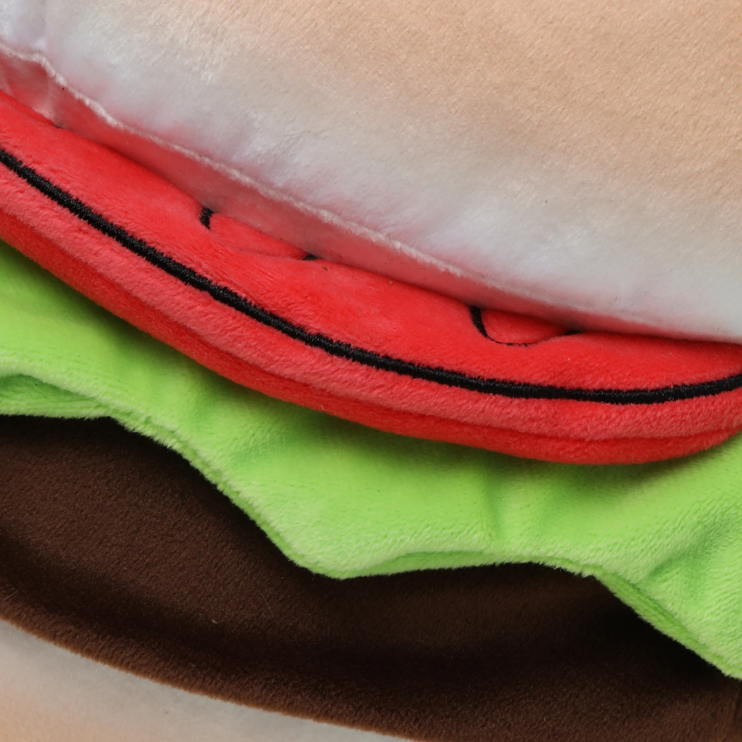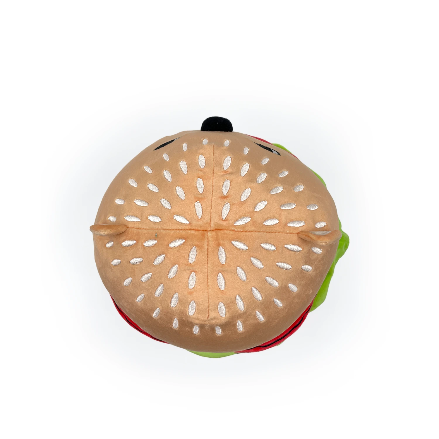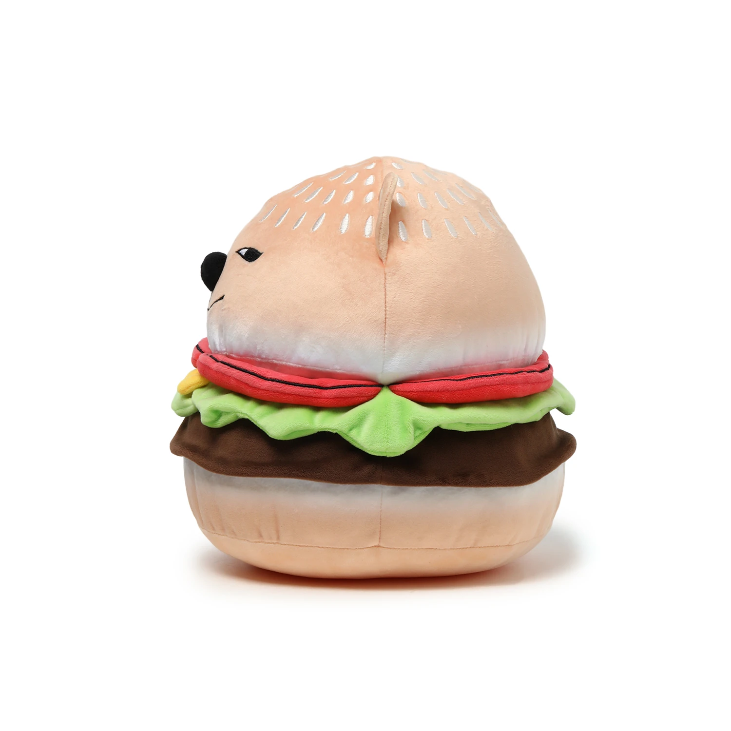 Cheems is back, lookin like a snack. Cheemsburger plush sits at 9 inches tall, stuffed full of ultra-soft 100% PP cotton. His head forms the hamburger buns, a sprinkle of sesame seeds peppering his head, with two cute ears standing tall. Inside the burger sits all the fillings: tomatoes, cheese, lettuce, and a patty. His expression is stitched into a sassy, smirking side-eye. Warning: as good as he looks, this plush is not edible. Please do not eat Cheems! This plush ships in a custom one-of-a-kind box to protect them from the elements on their journey to you.