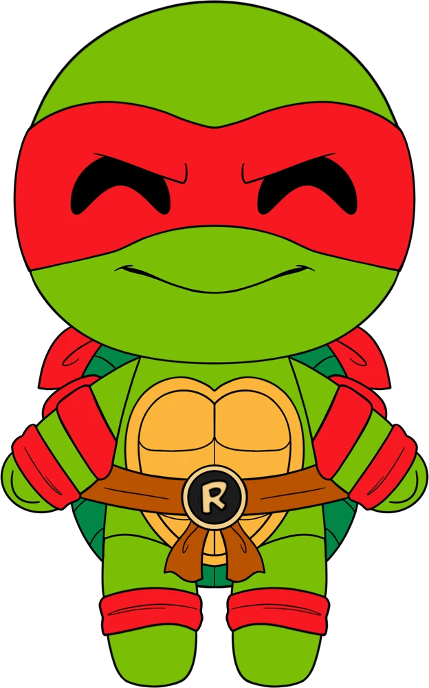 The Turtles are back to fight evil but now in the most adorable chibi form! Standing at 9 inches tall with furrowed brows and stern eyes staring out from the red mask that wraps around his perfectly round head and is tied at the back, a determined smile stretches across his cheerful face! The brown belt at his waist is secured by a gold medallion with an R on the front, and passes around his yellow abdomen and dark green shell, while his arm and leg bands along with elbow guards match the vibrant red of his mask. This plush is packed to the seams with 100% PP cotton and made of a mixture of sublimated and normal minky materials, absolutely perfect for cuddling or helping you finish the fight.