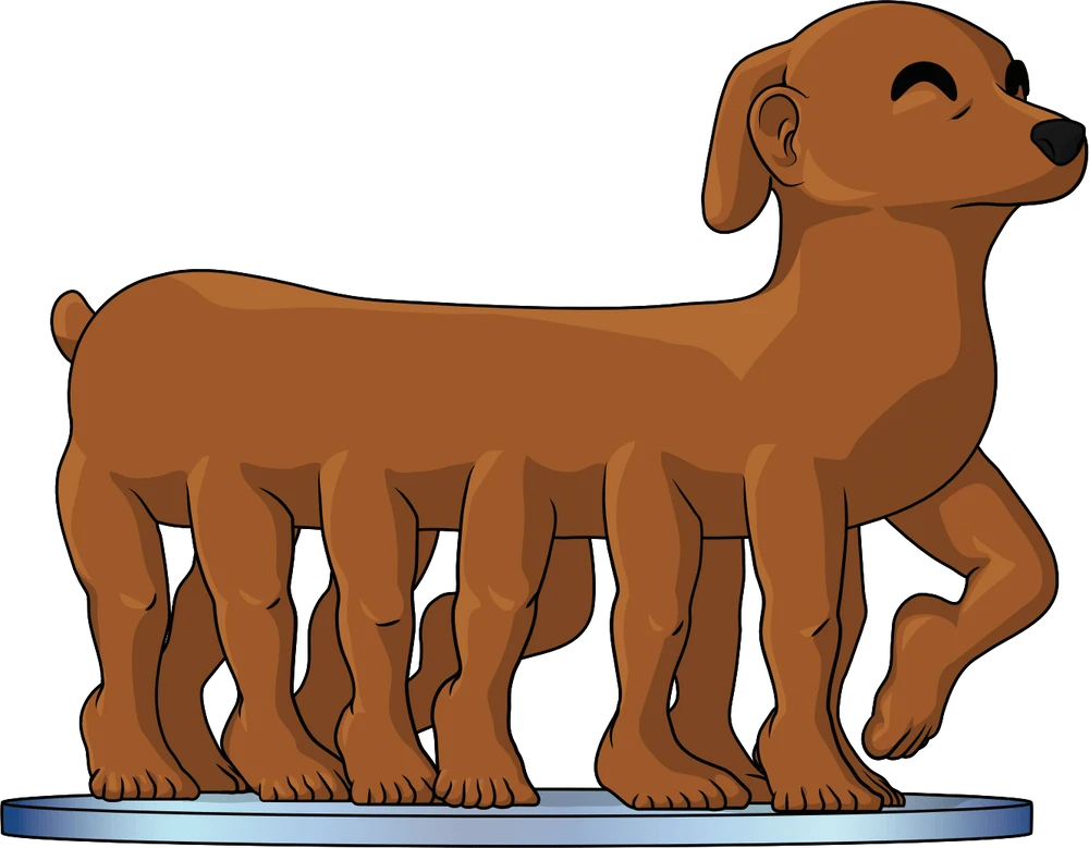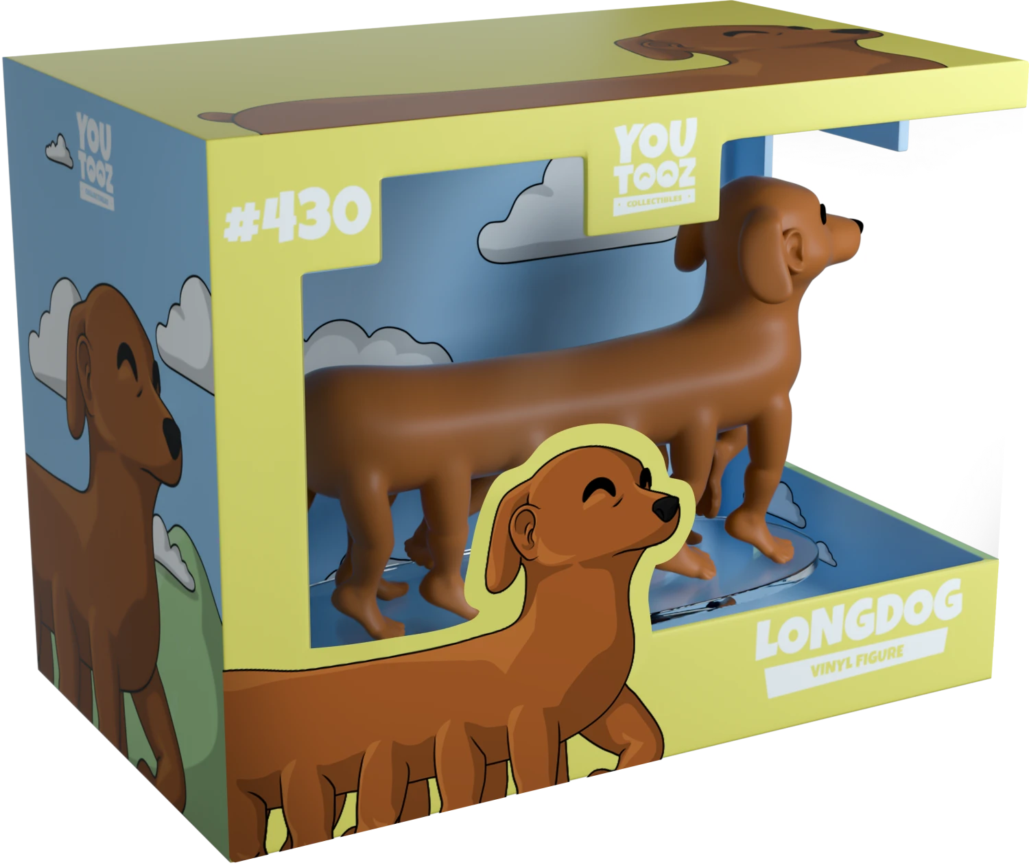 The figure stands at 3.2 inches tall, on 6 sets of legs. LongDog also sports human feet and a set of human ears in front of some floppy dog ears. The windowed display box is illustrated with green rolling hills speckled with white fluffy clouds in front of a blue sky. The interior of the box continues a bright blue sky with clouds floating across. On the protective sleeve are solid colours, with green from the hills and blue from the sky. This collectible was designed in collaboration with the community member @therealracckun, ships in a matte, embossed, protective outer sleeve and a custom-sized plastic protector for maximum protection during shipping.