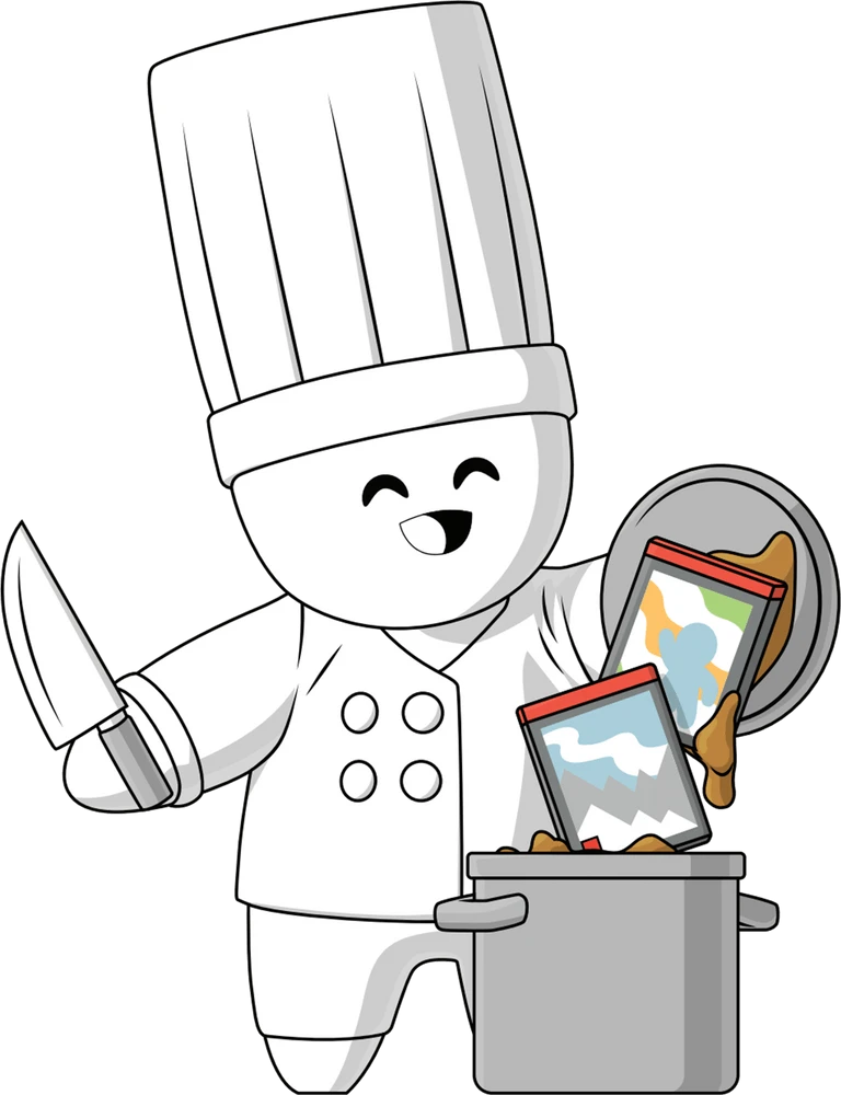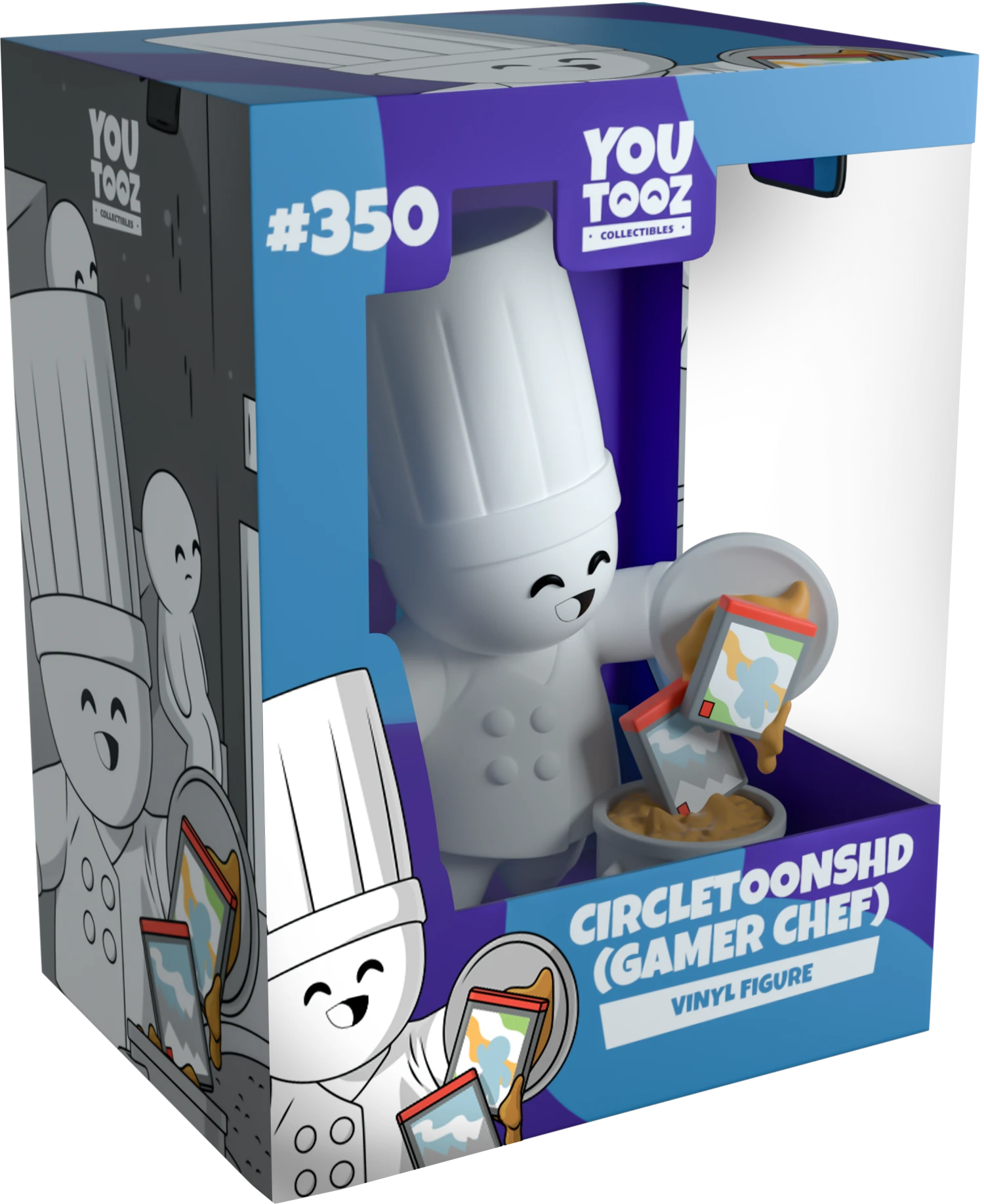 Hello its me, CircleToonsHD! Ditching his usual 2d constraints, the masterful Gamer Chef chops his way into Youtooz ready to cook up the most delicious gamer soup! Coming in at 3.7 inches tall from the top of his toque to the tips of his toes, a joyful smile crosses his round face as his brilliant white body is posed brandishing a large kitchen knife in his right hand while the left dumps the freshest ingredients from a dinner plate. His delicious orange soup splashes from its grey pot as the new ingredients are added, somehow not staining the crisp white apron hes wearing. The exterior of his packaging shows his view of the studio audience and camera crew as he puts on his show. While the interior is a simple pattern of kitchen knives over a thick blue and purple squiggle background. The protective sleeve shows him standing happily, arms raised against the black and grey backdrop of his kitchen. This collectible ships in a matte, embossed, protective outer sleeve and a custom sized plastic protector for maximum protection during shipping.