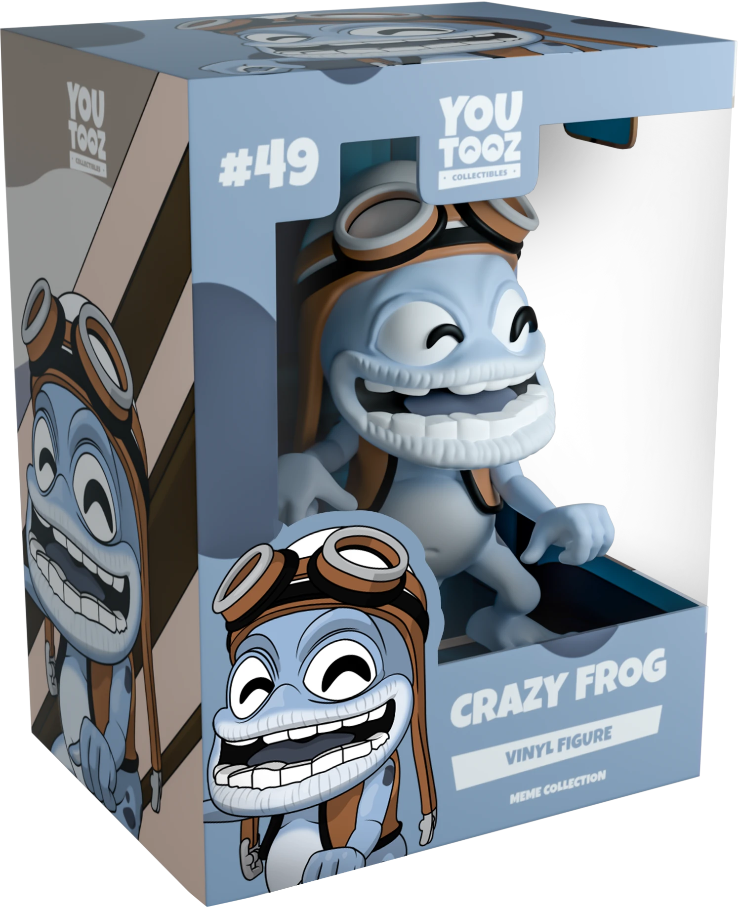 Crazy Frog stands mid-dance, hands out in front of him, designed in his iconic blue skin with a white belly, dark grey spots across his hips and shoulders. He has been sculpted with original black Youtooz eyes and flashes a large grin, showing off his teeth and his one missing tooth. On his head he wears his white helmet and his brown motorcycle goggles. He wears a brown vest. The exterior and interior of his double-walled window box has been designed to showcase the cityscape from the Axel F music video. This collectible ships in a matte, embossed, protective outer sleeve and a custom sized plastic protector for maximum protection during shipping.