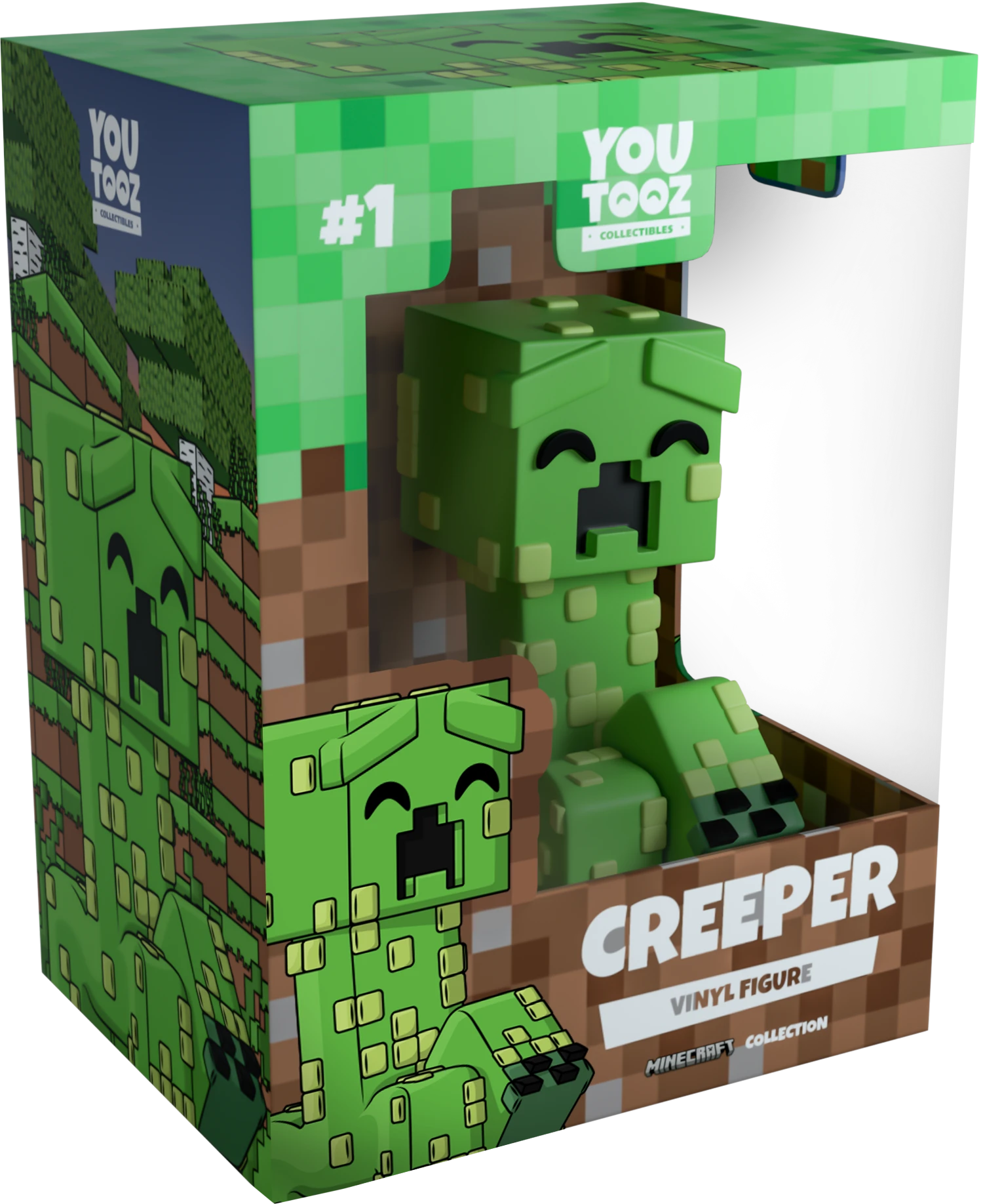 Walking into Youtooz at 4 inches tall and ready to explode, they stride forward with a raised front leg as the remaining three are planted on the ground. With raised eyebrows and deep black eyes and mouth, their cubed head sits tilted on a blocky green body that is covered in light green squares. The exterior of their packaging sees a Creeper exploding mid-air above a rocky field. While the interior surrounds them in brown first blocks, which continue onto the protective sleeve as their figure can be seen through the large clear window at the packagings front. This collectible ships in a matte, embossed, protective outer sleeve and a custom-sized plastic protector for maximum protection during shipping.