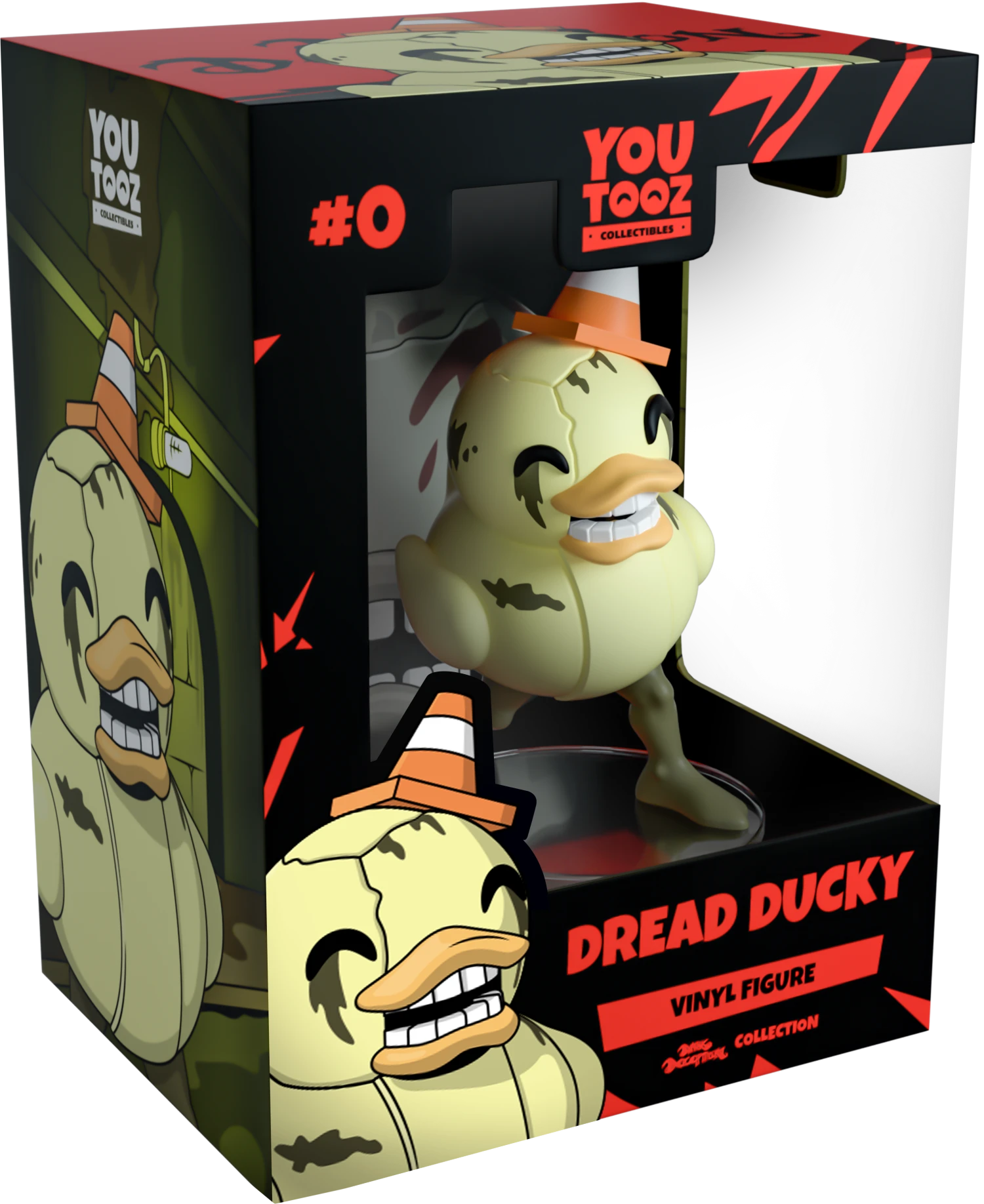 Standing at 4.5 inches, Dread Ducky makes his way out of the sewers and into your home! Don’t be fooled by the cute exterior look of this duck, Dread Duckies are masters of blending in and attacking unsuspecting mortals. On top of his head is an orange and white traffic cone. When you look closer, you can see areas of his head are cracked and there are dark green liquids covering him. His beak is a little open, revealing his teeth. The exterior of his double-walled packaging shows a dark and dreary sewer that definitely smells really bad. The interior is a scratching of a red and black background with Dread Ducky’s face fading inwards from the darkness. This collectible ships in a matte, embossed, protective outer sleeve and a custom sized plastic protector for maximum protection during shipping.