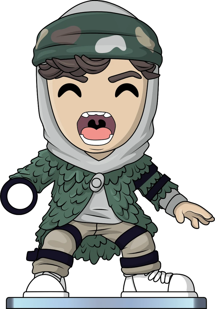 Stranger Things makes their grand entrance to the Youtooz world! Dustin stands at 4.4 inches, dressed in an incredibly detailed and stealthy outfit, never to be seen throughout the night. He can blend in with just about anything with his green bush-like cloak with his matching green camo bandana over his head. For his outfit underneath, he is dressed in a light gray hoodie with tan colored pants, complimented by his white sneakers. In his right hand, Dustin is holding onto a big flashlight. The exterior of his double-walled packaging shows the woods at night with a big rock in the center. When you look closer you can see a small Dustin peering out from behind the rock. The interior is a pattern of black, sticky, and slimy looking texture with the Stranger Things logo. This collectible ships in a matte, embossed, protective outer sleeve and a custom sized plastic protector for maximum protection during shipping.
