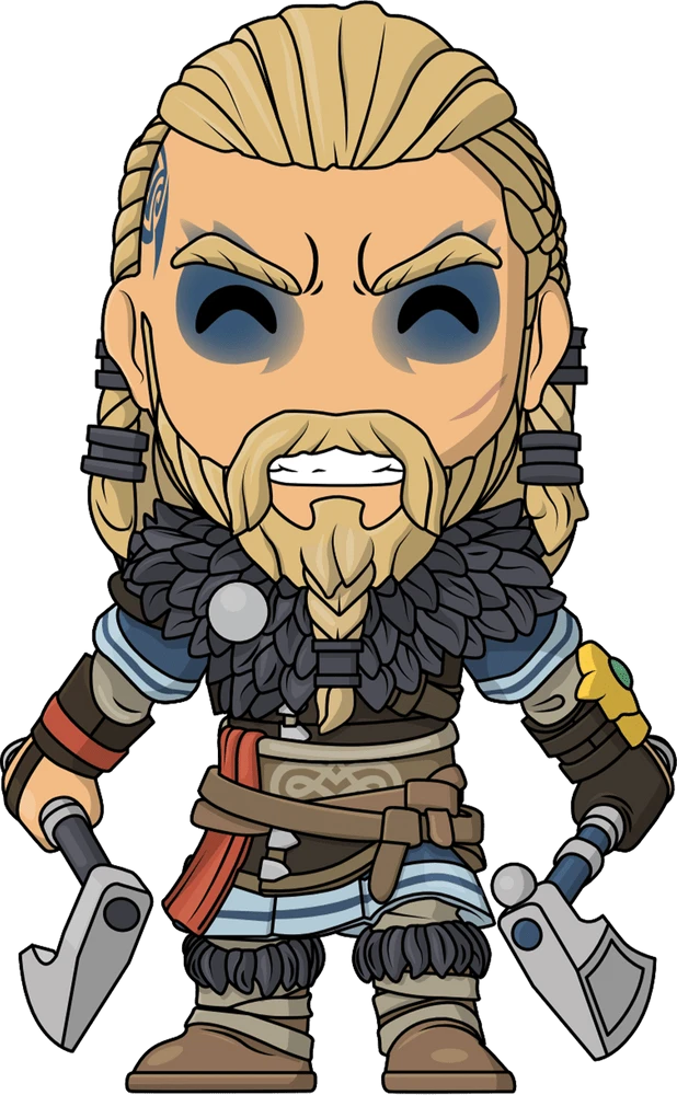 Eivor the Wolf-Kissed has charged head first into their Youtooz debut! At 4.5 inches tall with their blonde hair pulled back revealing a blue tattooed head, their long braids are adorned with numerous grey runic beads. Dark war paint covers his eyes under furrowed brows as white bared teeth peer through a blonde beard which is tied into a single plait. Poised ferociously dual wielding an axe in each partially gloved hand, he wears a chest piece of dark feathers over a striped blue tunic with a thick belt and brown straps. His brown strapped boots are topped with feathers that match the plumage of his chest. The exterior of his packaging sees a warship sailing through a rough sea under a cloudy sky with snow capped mountains in the background. While the interior is a stark black with the Assassins Creed Valhalla logo printed in blue at its back and the protective sleeve fades dark to light blue from top to bottom. This collectible ships in a matte, embossed, protective outer sleeve and a custom sized plastic protector for maximum protection during shipping.