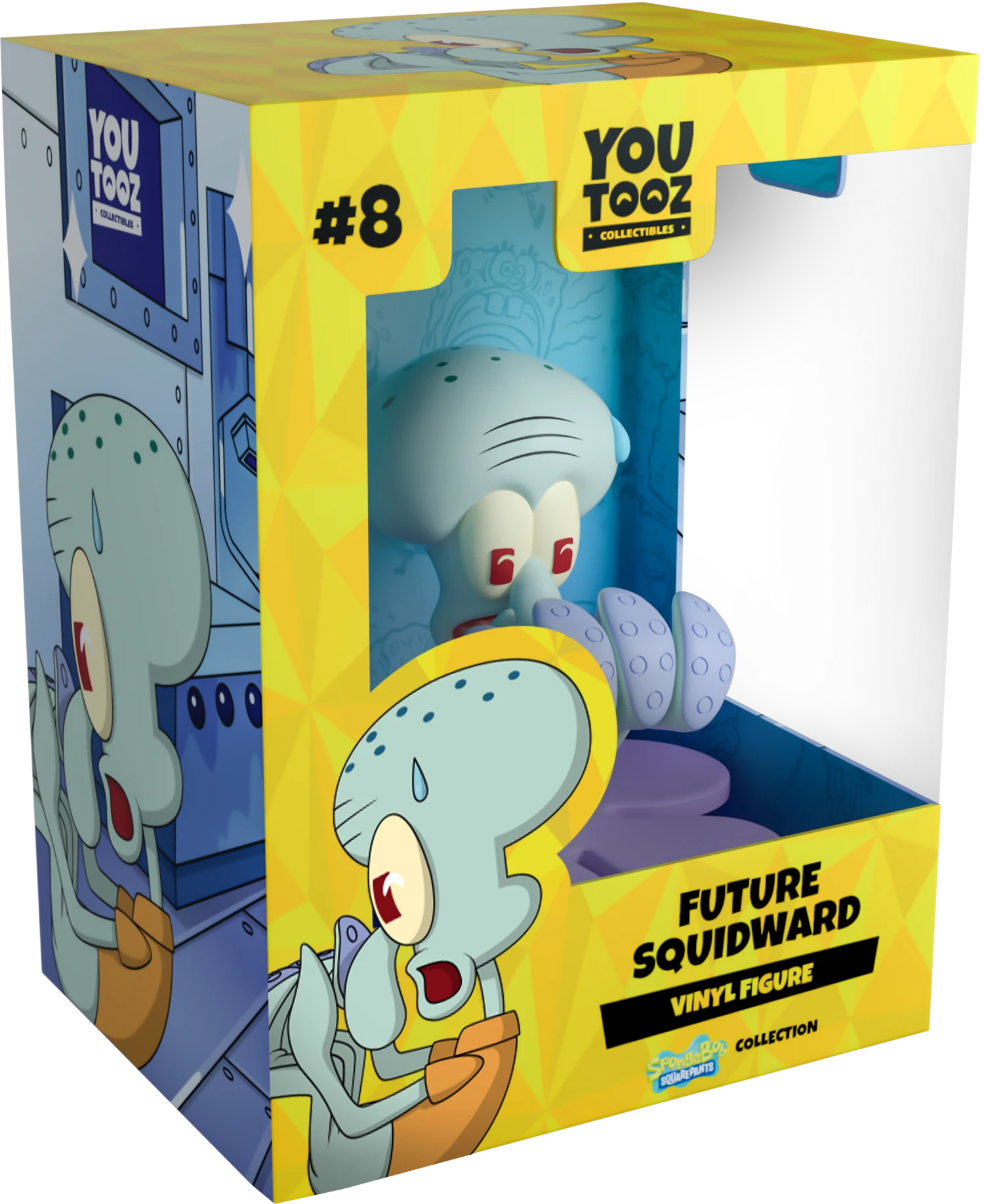 Squidward lays on his back at 3.1 inches tall. He has been sculpted open mouthed, mid-scream, a bead of sweat dripping down his forehead. His four legs stretch out in front of him and he wears his orange polo shirt. The exterior of his double-walled window box is designed with an image of the Future scene from the show. The interior of the packaging includes a blue background. This collectible ships in a matte, embossed, protective outer sleeve and a custom sized plastic protector for maximum protection during shipping.