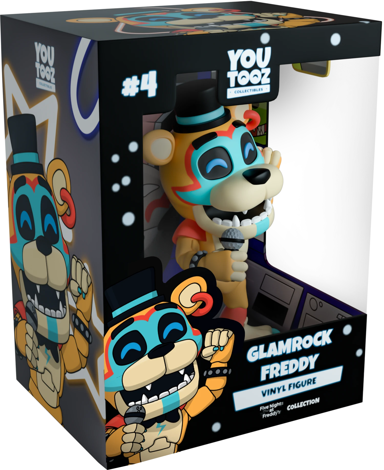 Glamrock Freddy stands at 4.7 inches tall showcasing a huge smile on his face. With a microphone in his right hand, he is singing his animatronic heart out. His left hand is stretched upwards in a closed fist position. He is seen wearing a black and blue top hat as well as a black bow tie with a blue lighting symbol across his chest plate. He is accessorized with black studded bracelets on both arms as well as an earring on his left ear. The exterior of his double-walled packaging shows the main lobby area of the Freddy Fazbears Mega Pizzaplex, with its checkered floors and a runway leading to the main concert stage. The interior shows a security monitor set up, showing Freddy, Chica, Monty and Roxy through the screens while Vanny stands behind the machine, watching. The protective sleeve shows Freddy, Chica, Monty, and Roxy playing their respective instruments in front of the Security Breach logo. This collectible ships in a matte, embossed, protective outer sleeve and a custom sized plastic protector for maximum protection during shipping.
