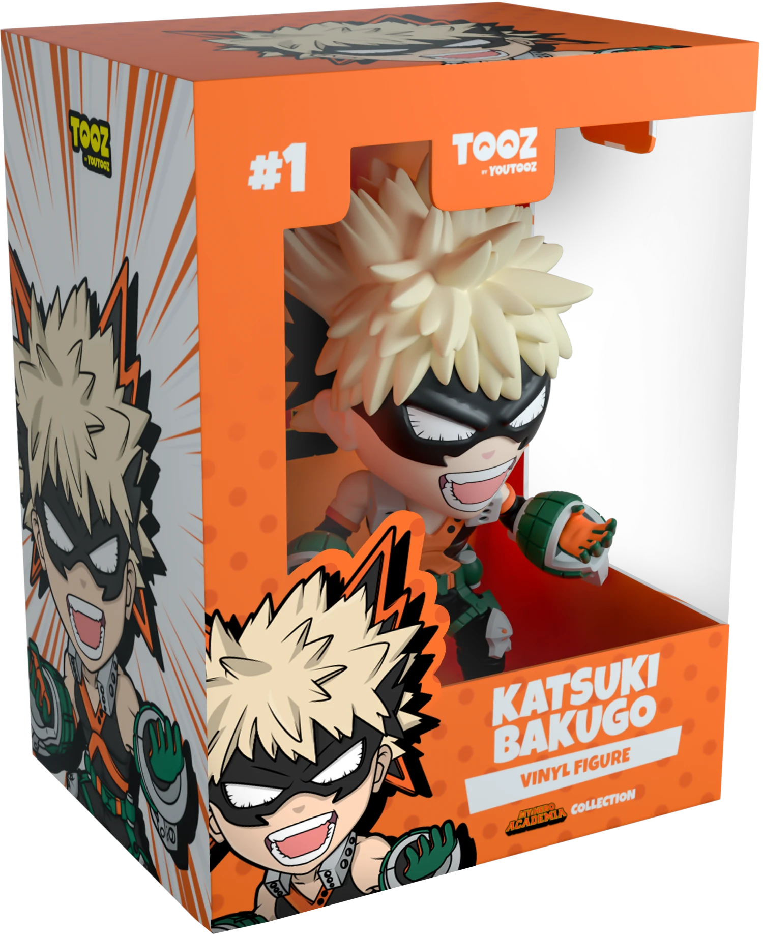 Bakugo makes his explosive Youtooz debut! At 5 inches tall, he prepares to attack with open palms outstretched and bellowing a fearsome yell! With two large black and orange headpieces exploding out from the back of a mess of blonde hair, a black mask covers his glowing white eyes and sits above an open mouth exposing his teeth. The large grenade gauntlets he wears over gloved hands match his green sectioned belt and contrast the large orange cross on the front his black sleeveless top, while his silver neckpiece matches the accents of his gauntlets as well as his knee pads. His costume is completed with thick soled orange and black boots. The exterior of his packaging is an illustration of Bakugo with dual shadows surrounded by vibrant orange impact lines, this palette continues through to its interior to surround them completely as a simple dot pattern fades out from the bottom. The protective sleeve shows a collage of the crew dissected by diagonal lines with the My Hero Academia Logo. This collectible ships in a matte, embossed, protective outer sleeve and a custom sized plastic protector for maximum protection during shipping.