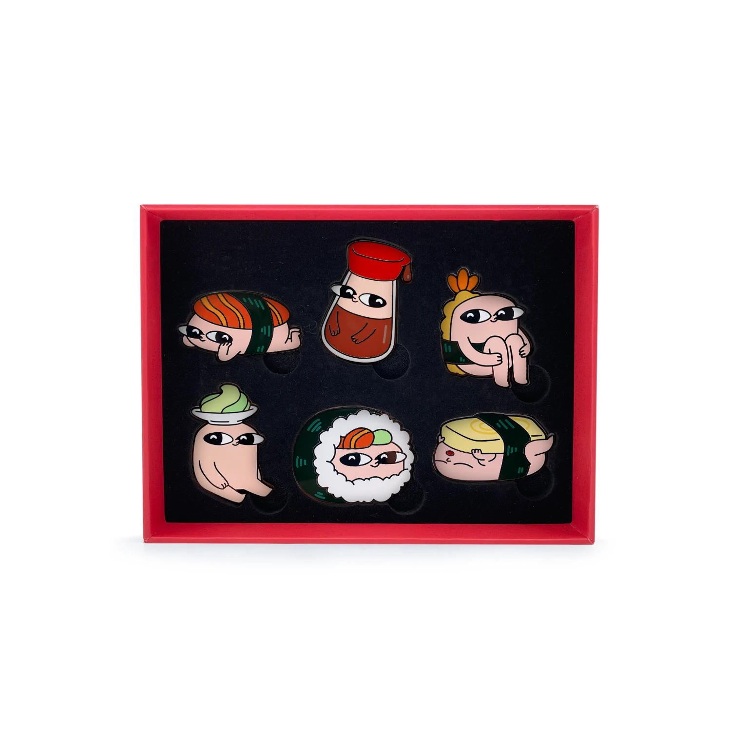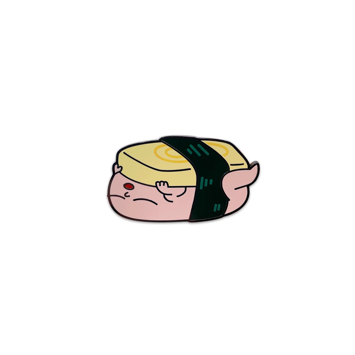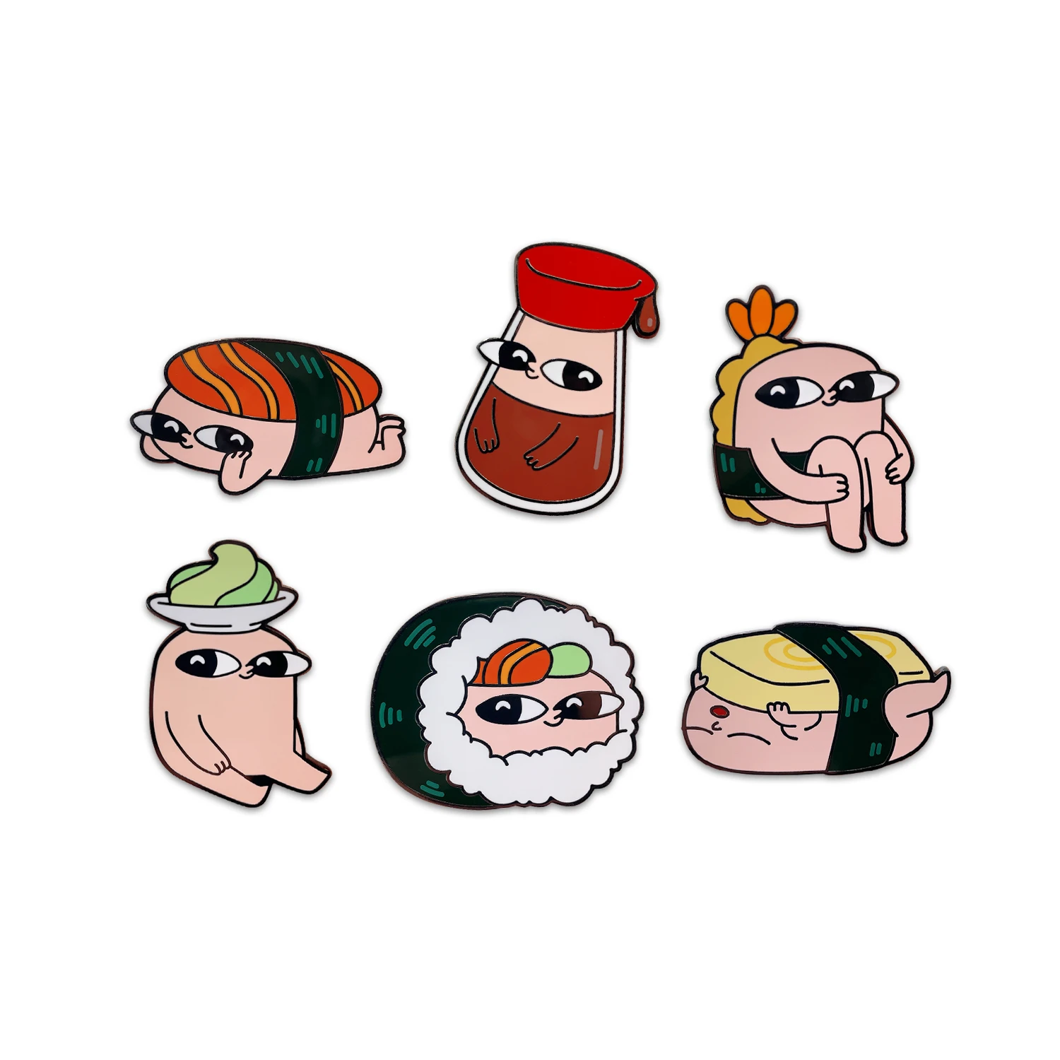 Containing 6 unique enamel pins that each measure in at 2 inches with a shiny, high-quality finish, Bean is truly the embodiment of Sushi as they make up each necessary part of a complete meal! Playfully resting on their stomach with salmon on their back, morphing into a soy sauce bottle, curling up against a tempura prawn, balancing a bowl of wasabi on their head, sitting snugly wrapped in a sushi roll and taking a snooze with some fried egg! Perfect as decoration on a cork board or showing off on your tote bag, backpack, fanny pack, jacket or wherever your heart desires, these pins are sure to turn heads and catch the eyes of anyone you pass, letting them know whos ready to chow down!