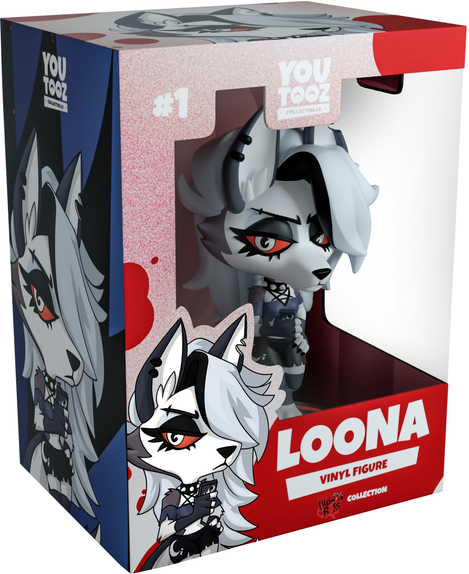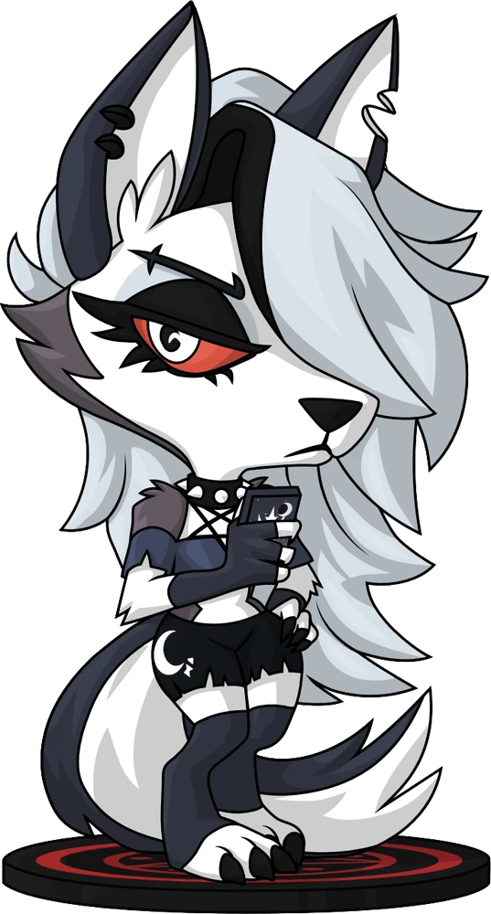 Loona lands at Youtooz to make her Youtooz debut, not that she wants to or anything Standing at 5 inches tall with her knees pressed together and a bushy black and white tail flicking out, her long grey fringe sweeps over an unimpressed face as the rest of her hair falls down her back. With deep red eyes glancing to the side and gripping a phone in her right paw as the left rests on her hip, she wears a spiked collar and blue top with pentagram straps at its front along with black and white shorts. The exterior of their packaging sees a cool blue silhouette against a dark background, while the interior surrounds them entirely in maroon stripes that are reminiscent of dirty wallpaper. The protective sleeve is then patterned with diagonal black and white stripes and printed with the Helluva Boss logo as their figure can be seen through the large clear display window at its front. This collectible was designed in collaboration with @therealracckun and ships in a matte, embossed, protective outer sleeve and a custom-sized plastic protector for maximum protection during shipping.