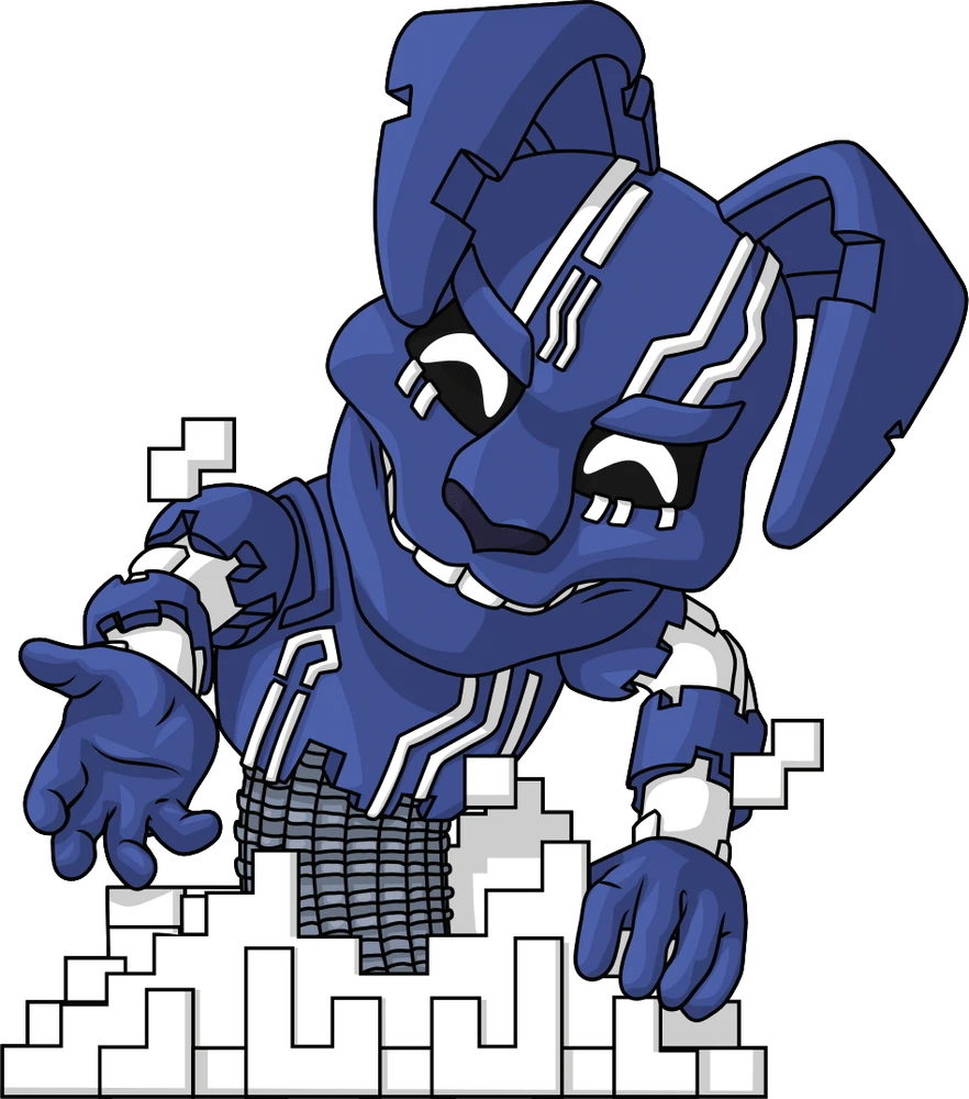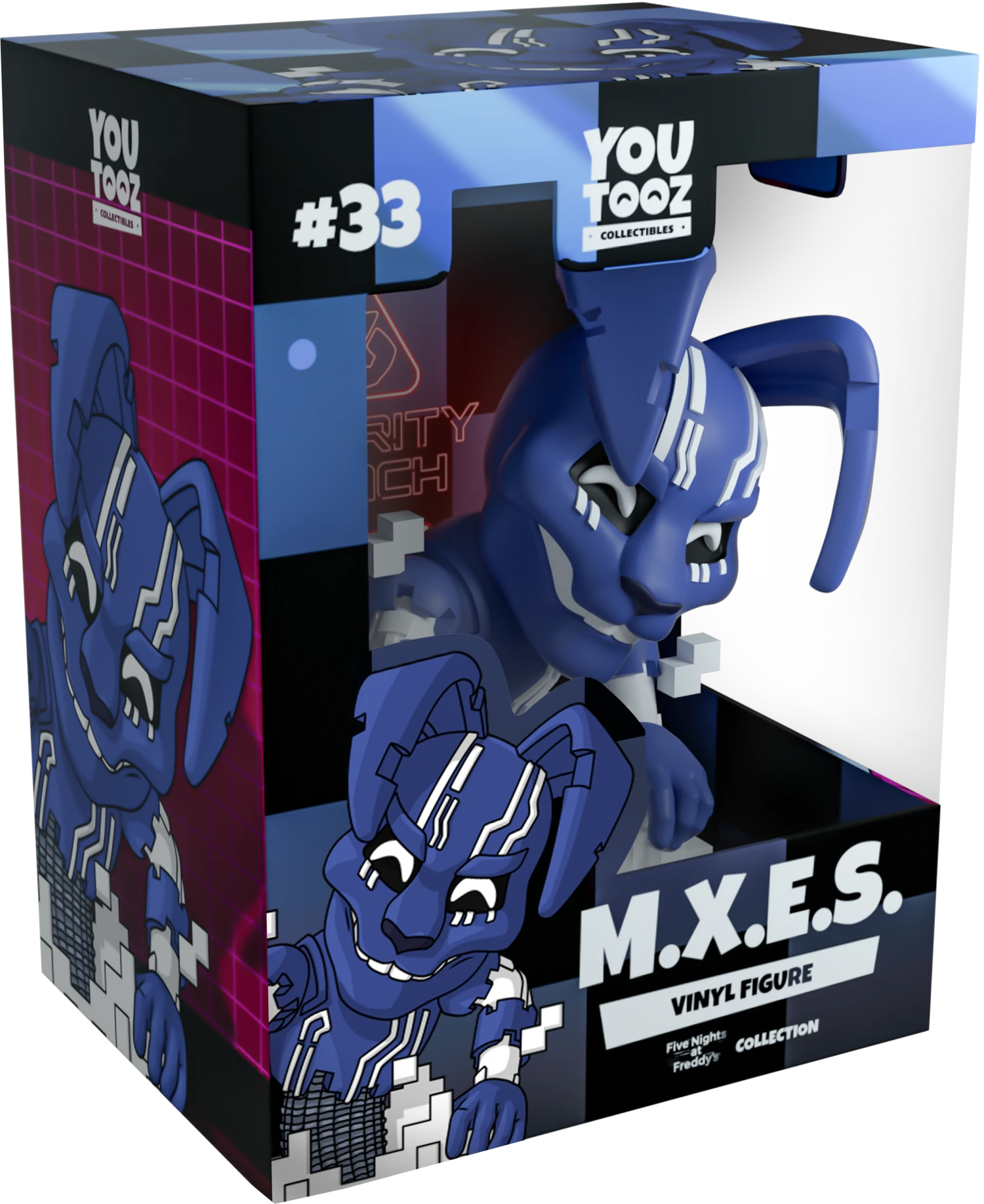 Emerging from a large white digital haze at 4.2 inches tall and reaching out a large hand almost welcomingly, an evil smile stretches wide across M.X.E.S rabbit face as long pointed ears hang down over their face and glowing white eyes shine from dark sockets as digital markings run down their dark blue body. The exterior of their packaging shows M.X.E.S reaching towards you with a large extended hand while the interior is printed with the neon Security breach logo and covered in checkered blue and black pattern which works its way onto the protective sleeve as their figure can be seen through the large clear display window at its front. This collectible ships in a matte, embossed, protective outer sleeve and a custom-sized plastic protector for maximum protection during shipping.