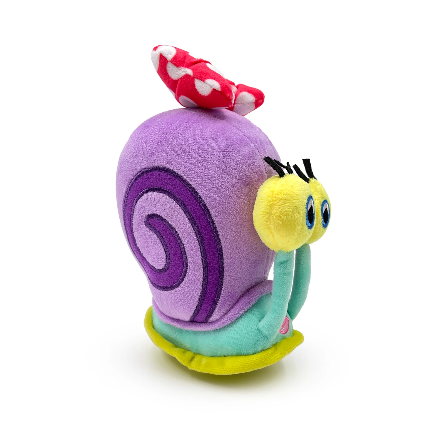 Gary’s crush, Mary is here and ready to turn some heads. Her eyelashes are beautifully curled upwards and her lips plumped with her pink lipstick. Her shell is a light purple with a darker purple swirl in the center. On the top of her shell is a red bow with white dots. This 6 inch stickie is stuffed with ultra-soft 100% PP cotton and comes with 4 sewn-in magnets so you can stick them together or onto any magnetic surface. This plush was designed in collaboration with the community member @ItsDirt_