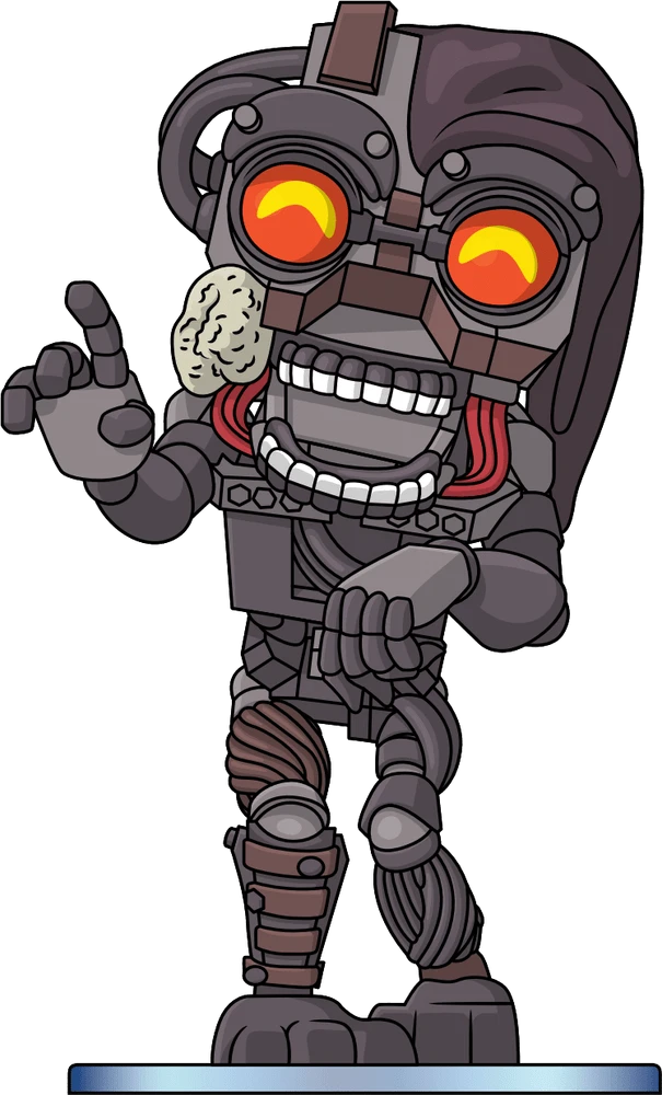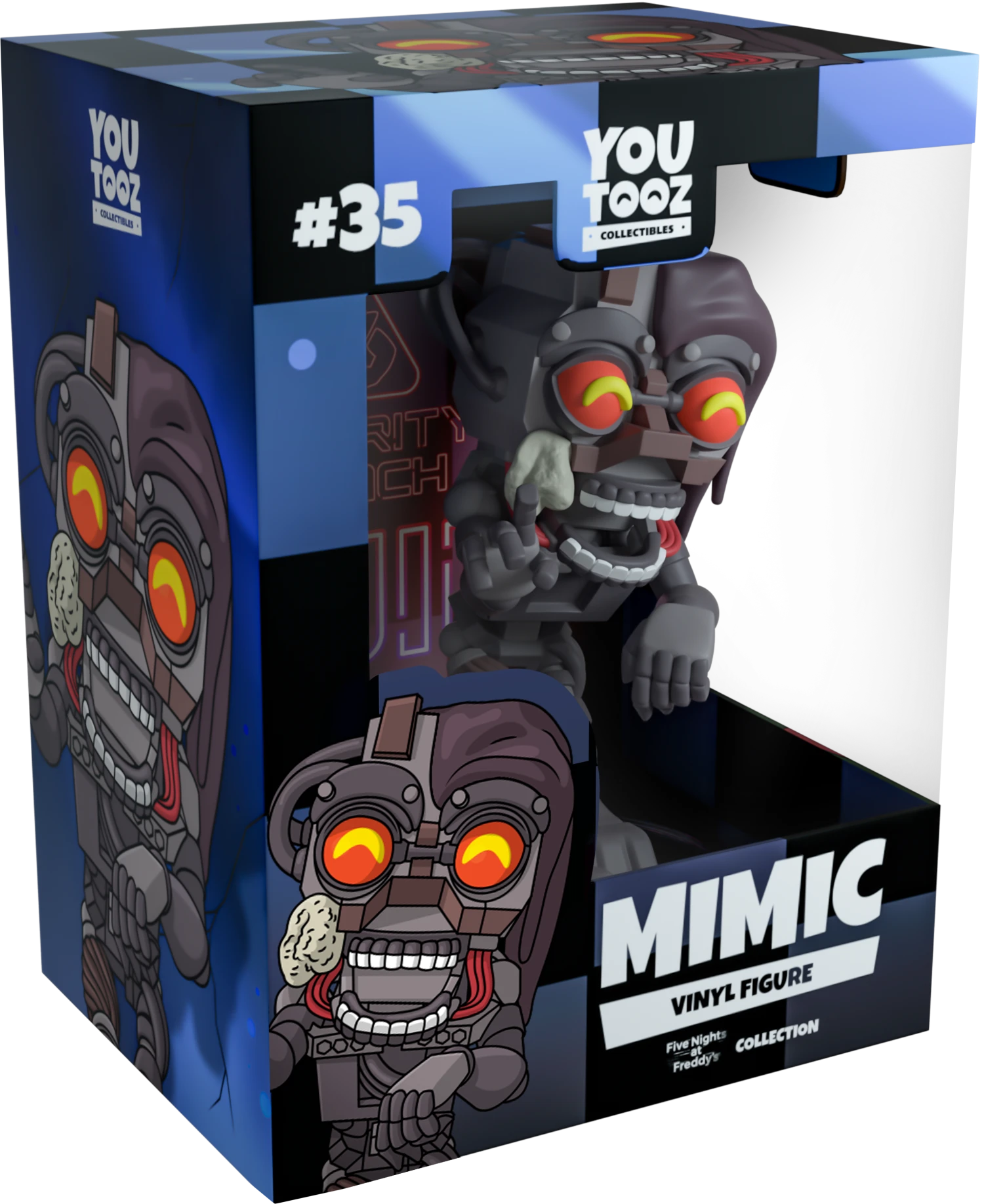 Raising a finger up inquisitively as Mimic stands at 4 inches tall and are posed bending forward with their knees and feet angled inwards, glowing orange and red eyes shine from a bare metallic face as red wires run down to a row of curved teeth on their bottom jaw. With a tattered piece of fabric covering one side of their head, thick wires and piping run through their blocky body to mimic muscles. The exterior of their packaging shows the Mimic making their way patiently through a dilapidated backstage while the interior is printed with the neon Security breach logo and covered in checkered blue and black pattern which works its way onto the protective sleeve as their figure can be seen through the large clear display window at its front. This collectible ships in a matte, embossed, protective outer sleeve and a custom-sized plastic protector for maximum protection during shipping.