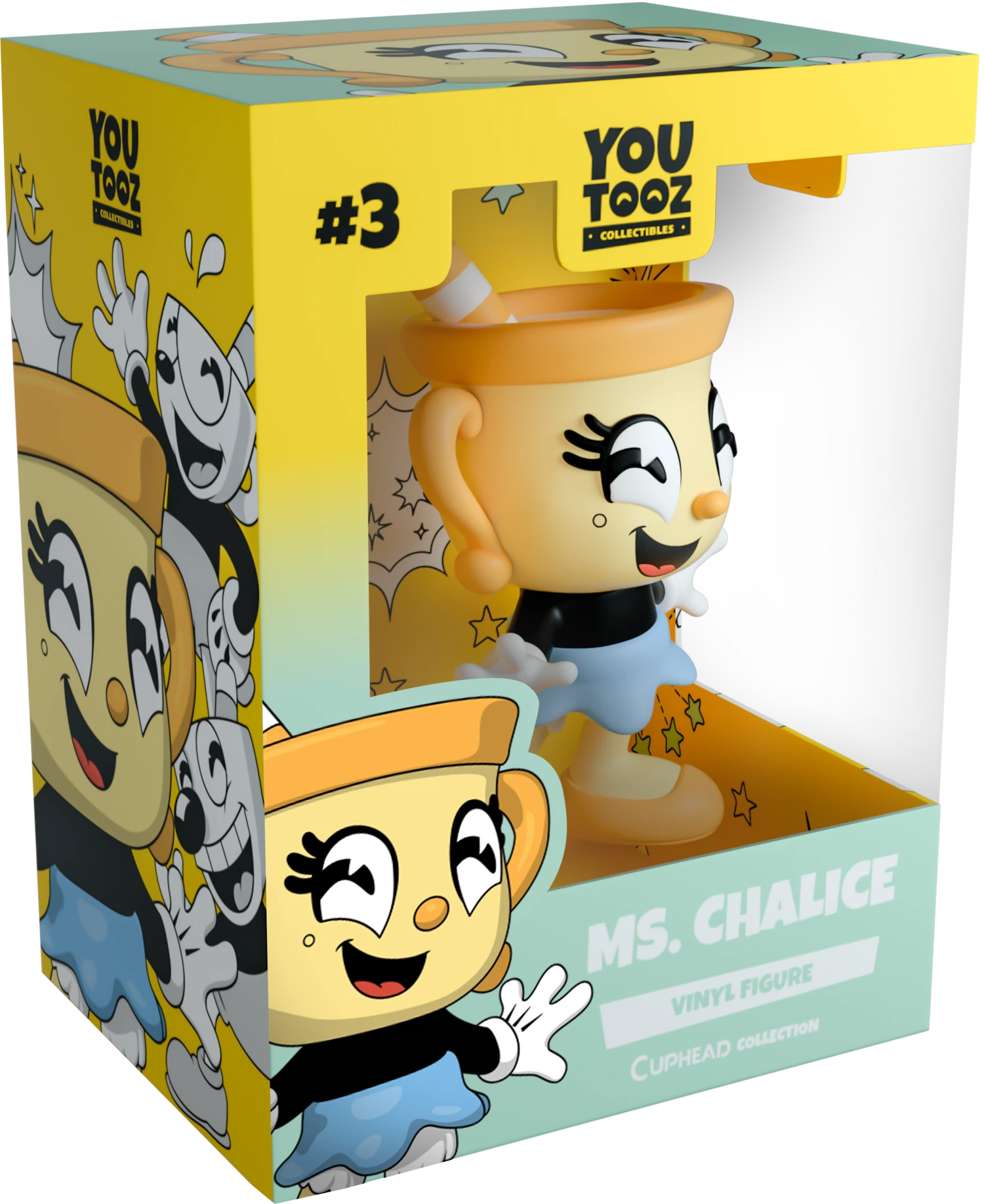 Ms. Chalice arrives at Youtooz looking incredibly cute! Standing at 4.5 inches, she has a genuine smile on her face. Her two golden chalice is complimented with two golden handles on each side of her face, as well as a beauty mark right under her right eye. She is topped off with a gold and white straw that is sticking out from her head. Her attire consists of a black top with a cute light blue skirt. You can see some white frills underneath the skirt that are peaking through. She is accessorized with white gloves and golden shoes. The exterior of her double-walled packaging is a bright yellow background with various Cuphead characters sketched out in black and white. The interior is also a bright yellow background with blue and white patterned fireworks going off. This collectible ships in a matte, embossed, protective outer sleeve and a custom sized plastic protector for maximum protection during shipping.
