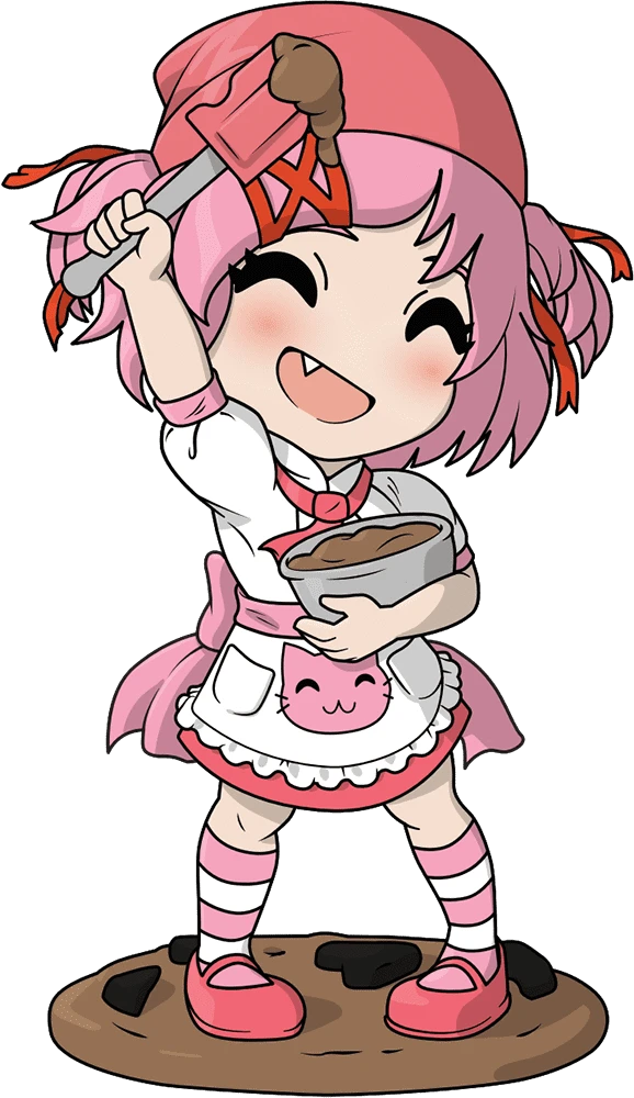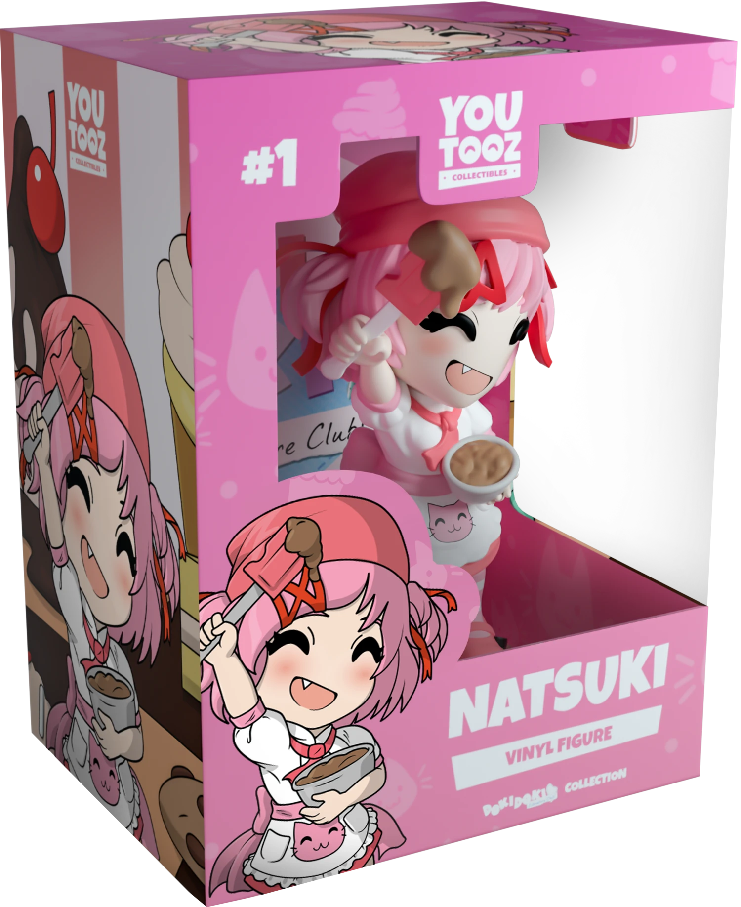 Well, even if you don’t know how to bake, there’s always some dirty work I could give to you. Natsuki arrives at Youtooz to display her baking prowess! Designed in collaboration with Minzzway and standing triumphantly at 4.4 inches tall atop a perfectly baked cookie, she raises her spatula up high letting the thick brown batter drip off it while holding a full mixing bowl in the other hand. A big open smile gleams across her blushing face revealing a single pointed tooth, while her pastel pink hair is tied with red ribbons and topped with a dark pink bandana. Her pink and white puffy dress is cinched at the waist with a long pink ribbon thats tied in a large bow at the back while she wears long pink and white striped socks. The exterior of her packaging shows a plethora of the sweetest baked treats you can imagine. While the interior is a vibrant pink background speckled with cute cat faces and cupcakes. The protective sleeve continues the sweet tooth motif, with the most decadent desserts flowing across the exterior. This collectable ships in a matte, embossed, protective outer sleeve and a custom sized plastic protector for maximum protection during shipping. This figure was made in collaboration with community member@Minzzway
