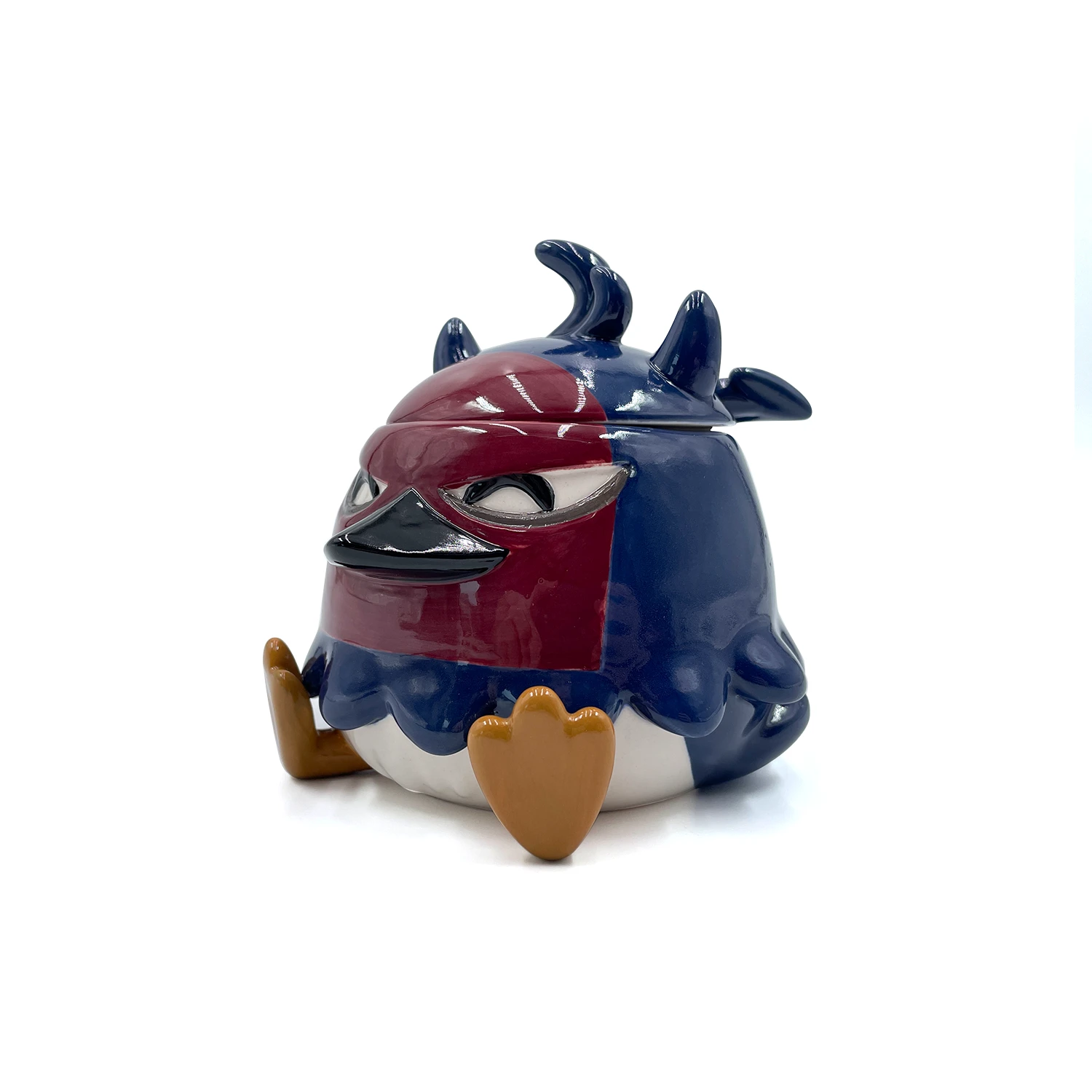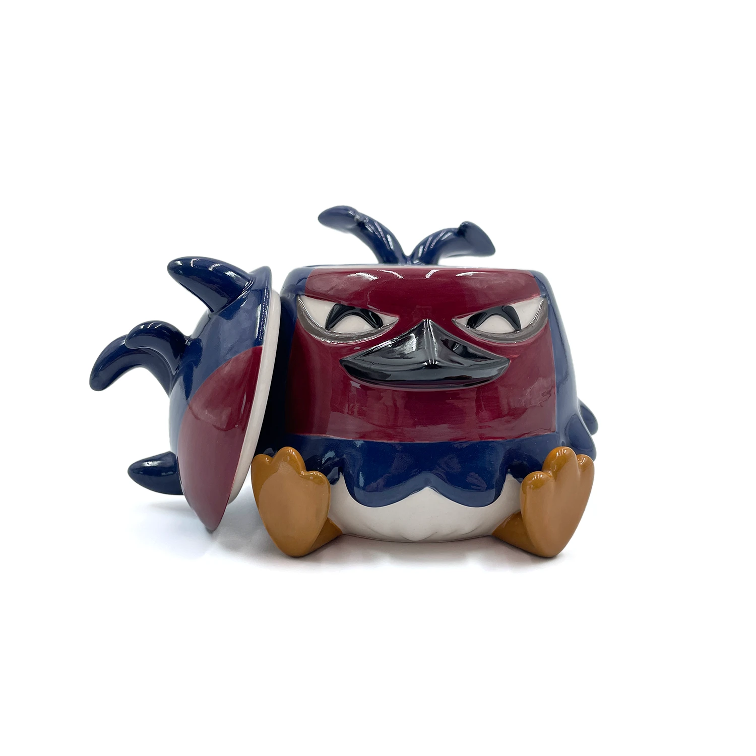 Your feathers will never be ruffled when you start your day off sipping your morning coffee, tea or OJ from Nero! Made of ceramic, this mug is beautifully sculpted in Neros likeness with dark blue plumage and horns making up its body, while a deep maroon face is the perfect frame for her angular eyes and pointed beak. Sat with her two talons sticking forward, a long two pronged tail folds up at the back of the mug providing a sturdy and stylish handle. Not a coffee person? Don’t worry! You can fill her head with trinkets, a plant or anything your heart desires! Nero would prefer to be hand washed but is perfectly microwave and dishwasher safe. Watch her spin round and round in the microwave as she gets you ready to become the Wizard King!