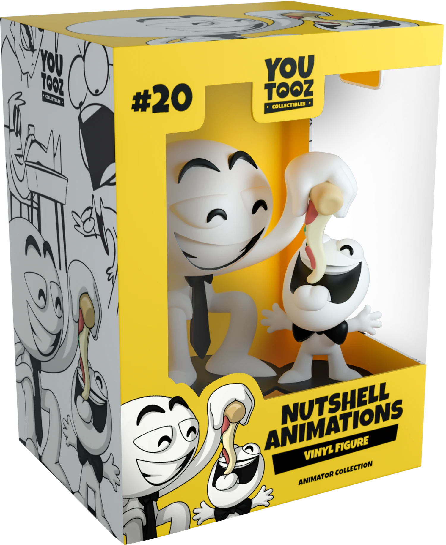 Youtooz is graced by the debut of the meme lord Nutshell Animations! Squatting in at 3.5 inches tall with the largest toothy grin smeared across his stark white face, hes posed with both feet planted firmly in place while one hand rests on his knee and the other raises a steamy slice of za up to feed into Acorns mouth. Acorns arms are shot out in delight as a happy tongue sticks out of his smiling mouth, they both wear the starkest contrasting black tie and bowtie complimenting their pale bodies perfectly. The exterior of his packaging is covered in illustrations of the Nutshell Animations crew. While the interior is a simple burnt yellow gradient. The protective sleeve continues the illustration motif with large pictures of Nutshell surrounding it. This collectible ships in a matte, embossed, protective outer sleeve and a custom sized plastic protector for maximum protection during shipping.