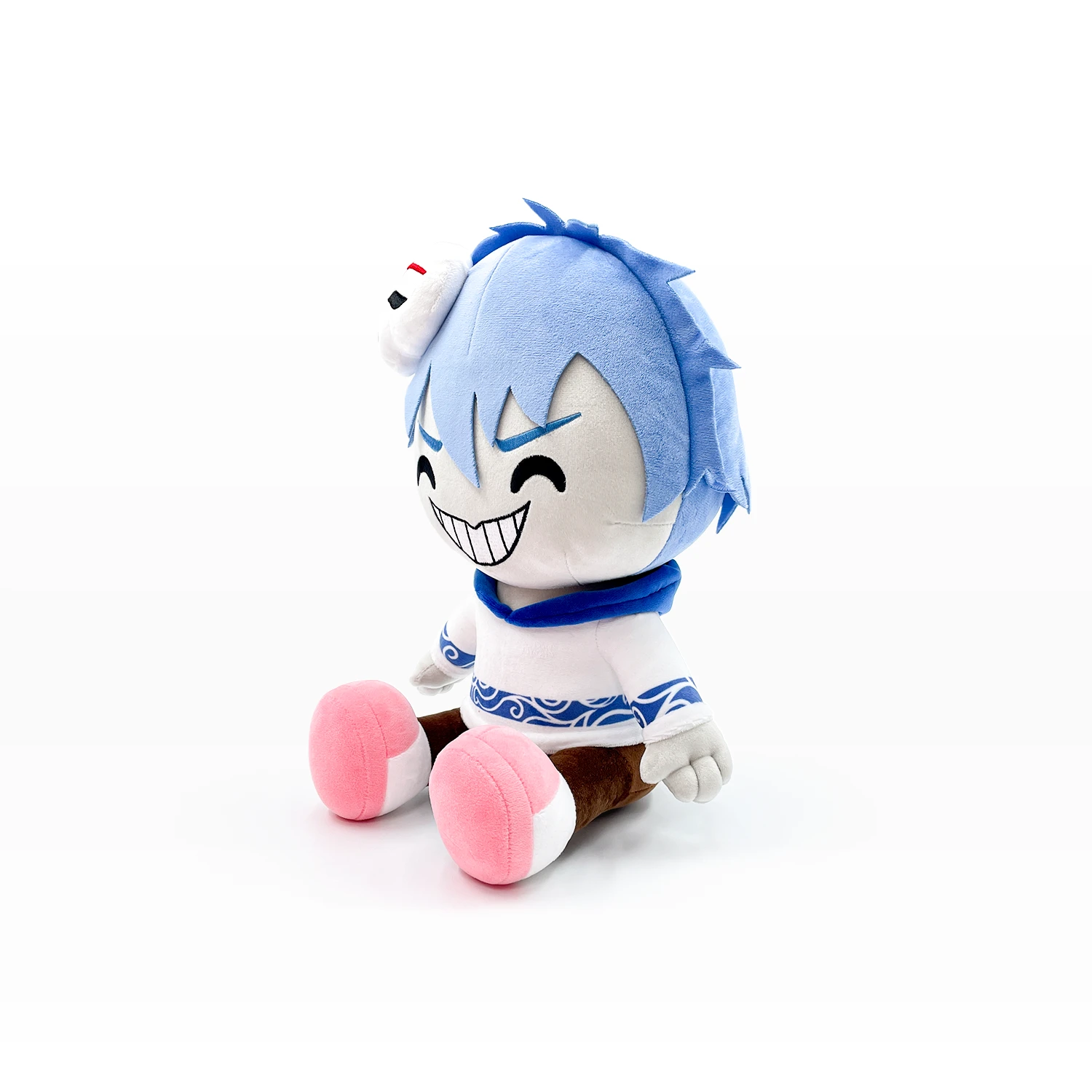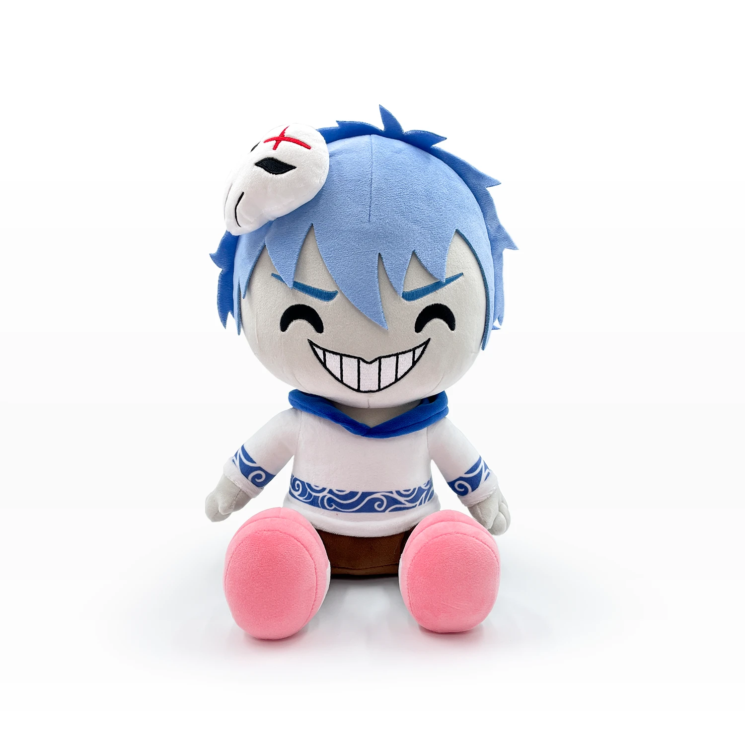 Nux Taku is created in an adorable plush form with beautiful blue hair and off-white skin tone. Sporting a devilish grin, he has a small mask on the front of his head with a red X, two evil eyes and vertical separations. On the hoodie is a tribal pattern, as well as a blue hood. Completed with black pants and pink feet, Nux Taku plush is stuffed with ultra-soft 100% PP cotton and ready to show you how to flex. It is 12 inches tall and ships in a custom one-of-a-kind box to protect it from the elements on his journey to you.
