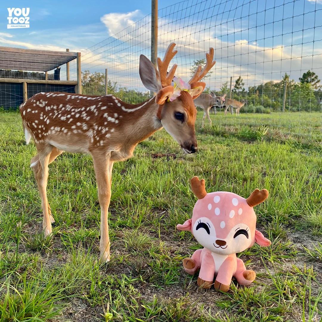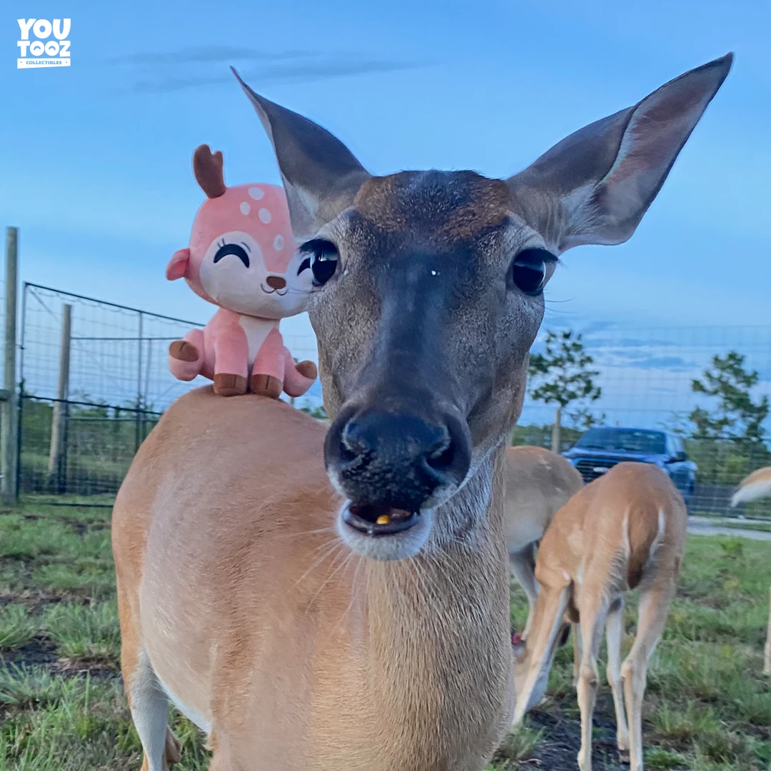 Oh Deer!! Sitting at 9 inches, this adorable deer plushie makes her debut at Youtooz. Her adorable ears droop on each side of her head while her antlers are poking out from above. Her face shows a delighted smile with her embroidered Youtooz eyes curve upward. Her body has a cute spotted pattern going from her head down her back with her puffy little tail at the bottom. This plush was created by Kastro and is made out of 100% soft PP cotton and is generously filled with stuffing.