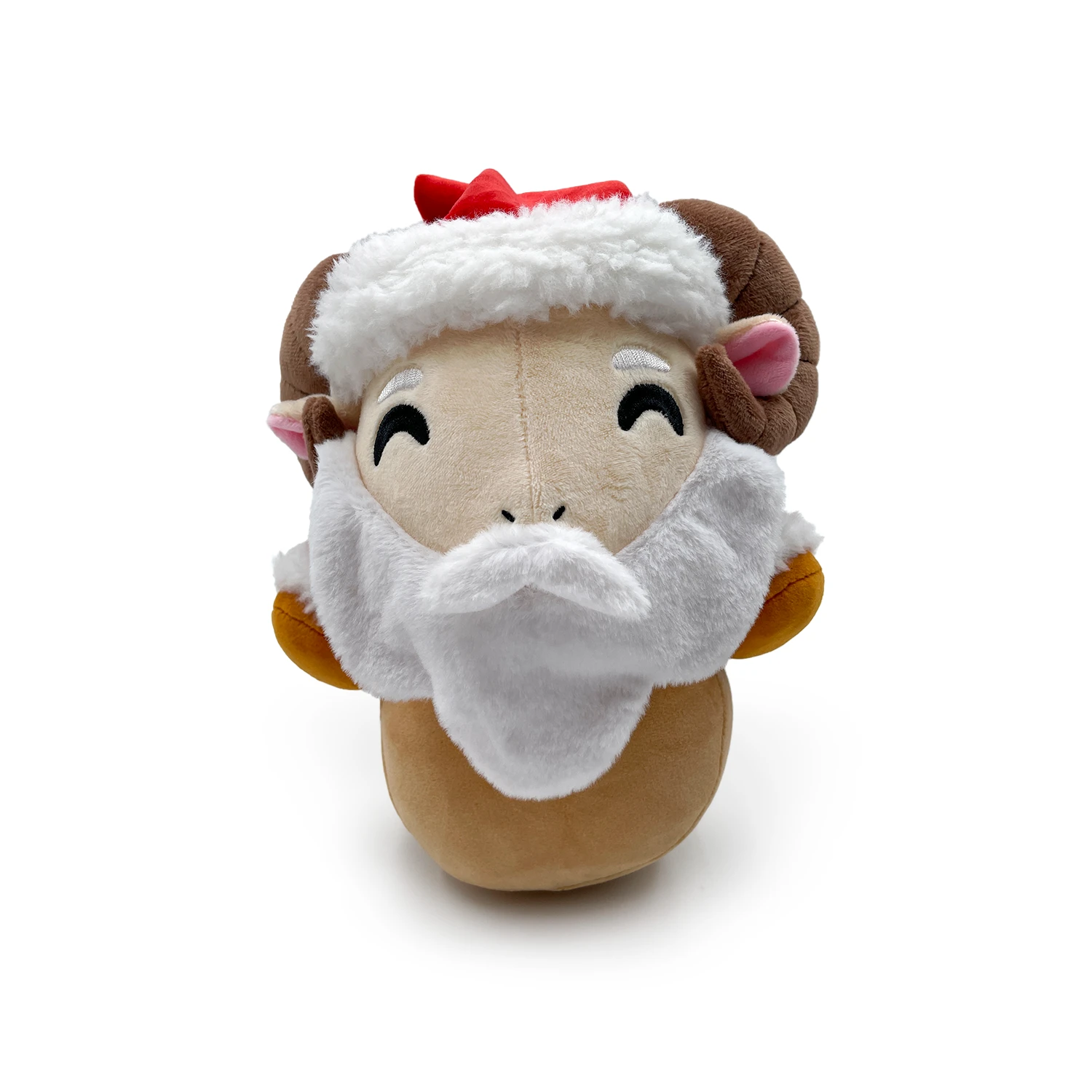 Santa Rammie is here to bring everything on your wishlist… or maybe something else if you haven’t been the best this year. Rammie is dressed in the classic Santa hat with a matching red and white jacket. Wrapped around his torso is a black belt. He is lying down on top of a big hefty tan bag that is labeled “COAL.” This plush is made out of 100% soft PP cotton and is generously filled with stuffing.