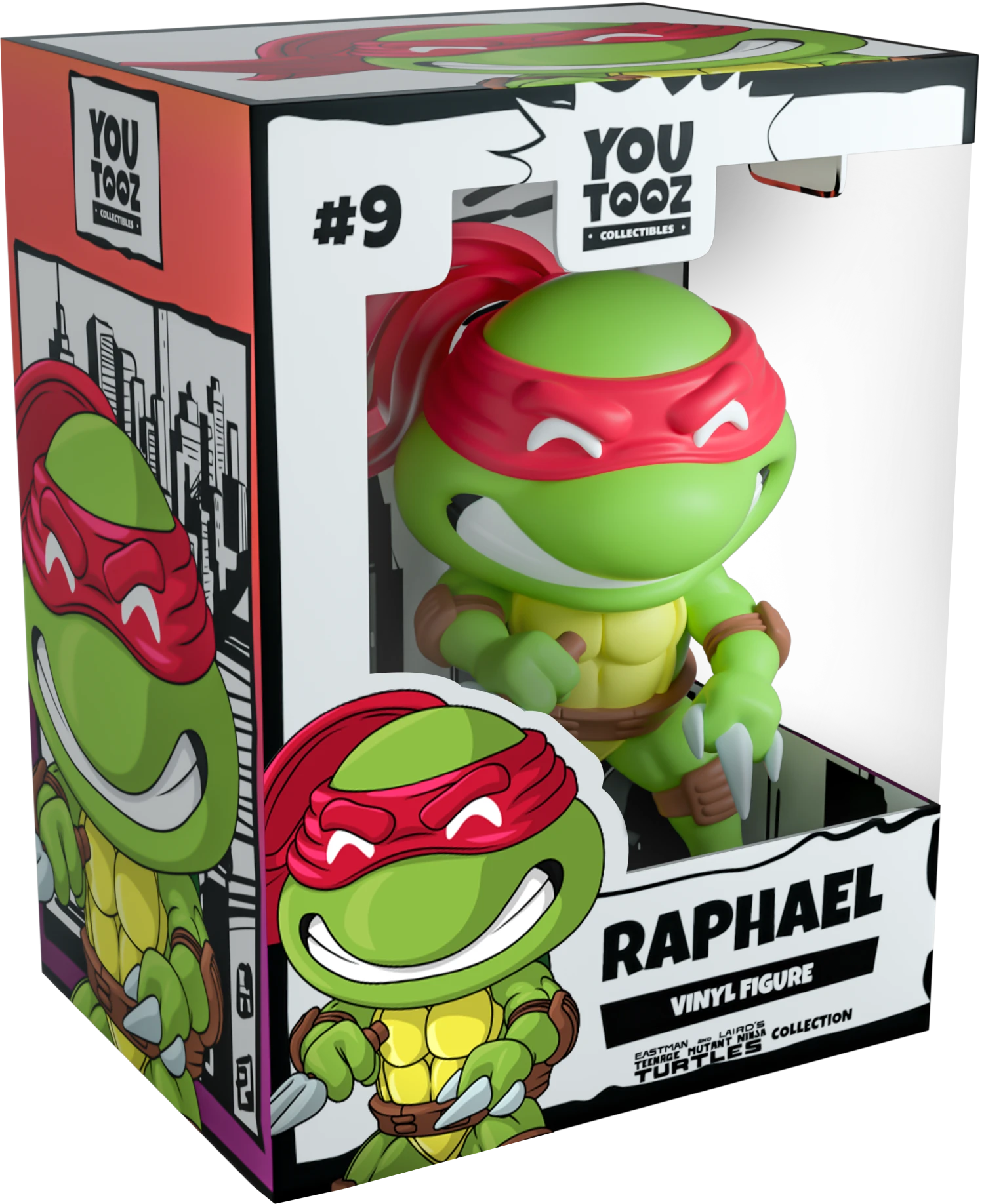 Raphael returns to Youtooz wearing a vibrant red mask to match his brothers in this classic throwback to when the turtles began their fight against evil! Standing at 4.2 inches tall his face stretches into a menacing smile with clenched teeth as hes in the throes of battle, posed gripping his twin Sai pointed forward and ready to attack! The thick strap that wraps around his dark green shell and waist is perfect for when he needs to sheath his weapons and matches the brown elbow and knee guards around his joints. The exterior of his packaging sees him standing atop a building surveying the stretching city and harbor underneath. The interior is the silhouette of a city skyline reflecting off the lake at its front while the protective packaging has him posing in front of a comic book-esque panel as his figure can be seen through the large clear window at its front. This collectible ships in a matte, embossed, protective outer sleeve and a custom sized plastic protector for maximum protection during shipping.