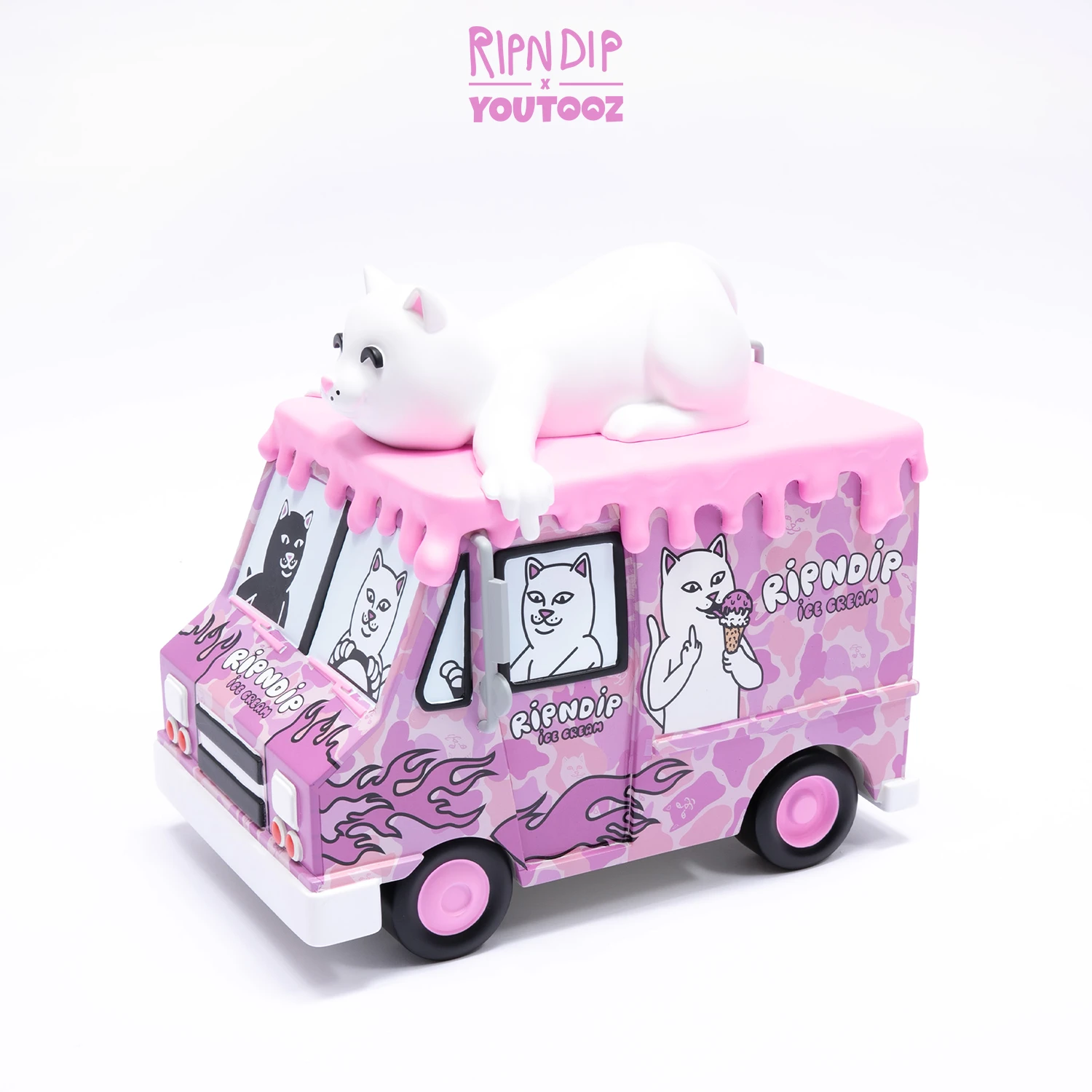 Nermal and Jermal blast onto the scene in the sickest ice cream truck youve ever seen! Having finished throwing ice cream at kids and doing donuts in the parking lot, these speed demons can be seen happily joyriding from the front windows of their 1ft tall gas-guzzler that is painted in the most immaculate pink camo with dark pink licks of flame emanating from around headlights and front wheels. Its sides are decaled with images of Nermal eating ice cream and flippin us the bird, as a giant smiling Nermal adorns its top, tightly gripping the roof which is covered with a vibrant pink ice cream that melts down over its sides in huge gooey dollops.. This collectible ships nestled snugly within the protective black foam interior of its heavy duty packaging, which is printed with flames of deep pink erupting from its base over a pink camo pattern that matches the paint job of the truck.