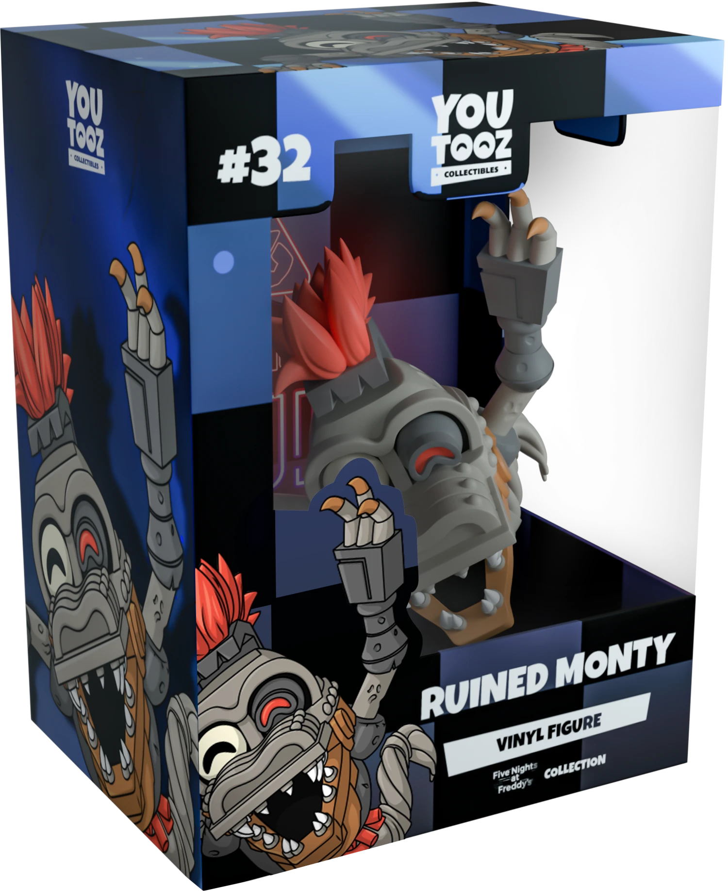 Pulling himself along with a clawed hand as he scrambles forward at 3.6 inches tall, Monty raises an cold metallic arm upwards past his red mohawk as his bare face sits above an open mouth full of sharp teeth. With a glowing red eye shining from his vacant left socket, red wires fall out from his exposed chest as what remains of his spine and legs twist and curl around behind him. The exterior of his packaging shows Montys head emerging from the water of a flooded basement while the interior is printed with the neon Security breach logo and covered in checkered blue and black pattern which works its way onto the protective sleeve as his figure can be seen through the large clear display window at its front. This collectible ships in a matte, embossed, protective outer sleeve and a custom-sized plastic protector for maximum protection during shipping.