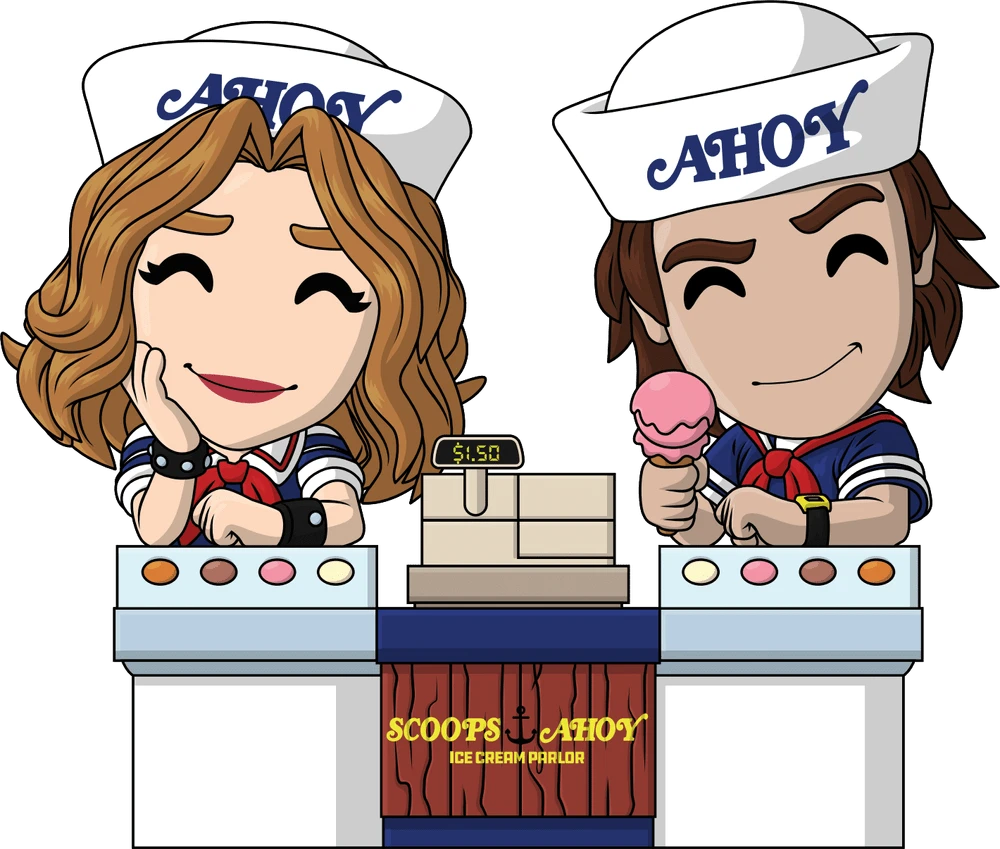 Steve and Robin are here to serve up a delicious scoop of ice cream as Americas favorite place to cool down arrives at Youtooz! At 5 inches tall, the pair lean forward with their arms resting on the top of the long ice cream cabinet and stand on either side of a beige cash register as they wear matching blue and white sailor uniforms with red neck ties and white hats with ahoy written on the front. With a raised eyebrow and a slight smirk, Steve holds out a pink ice cream cone in his right hand while Robins long locks of wavy brown hair frame her smiling red lipped face which rests on her right hand. The exterior of their packaging sees the duo waiting to serve up a delicious treat within the striped walls of Scoops Ahoy, while the interior is a series of anchors over a light blue background. The protective sleeve is a light blue wave pattern over a stark white as their figure can be seen through the large clear display window at its front. This collectible ships in a matte, embossed, protective outer sleeve and a custom sized plastic protector for maximum protection during shipping.