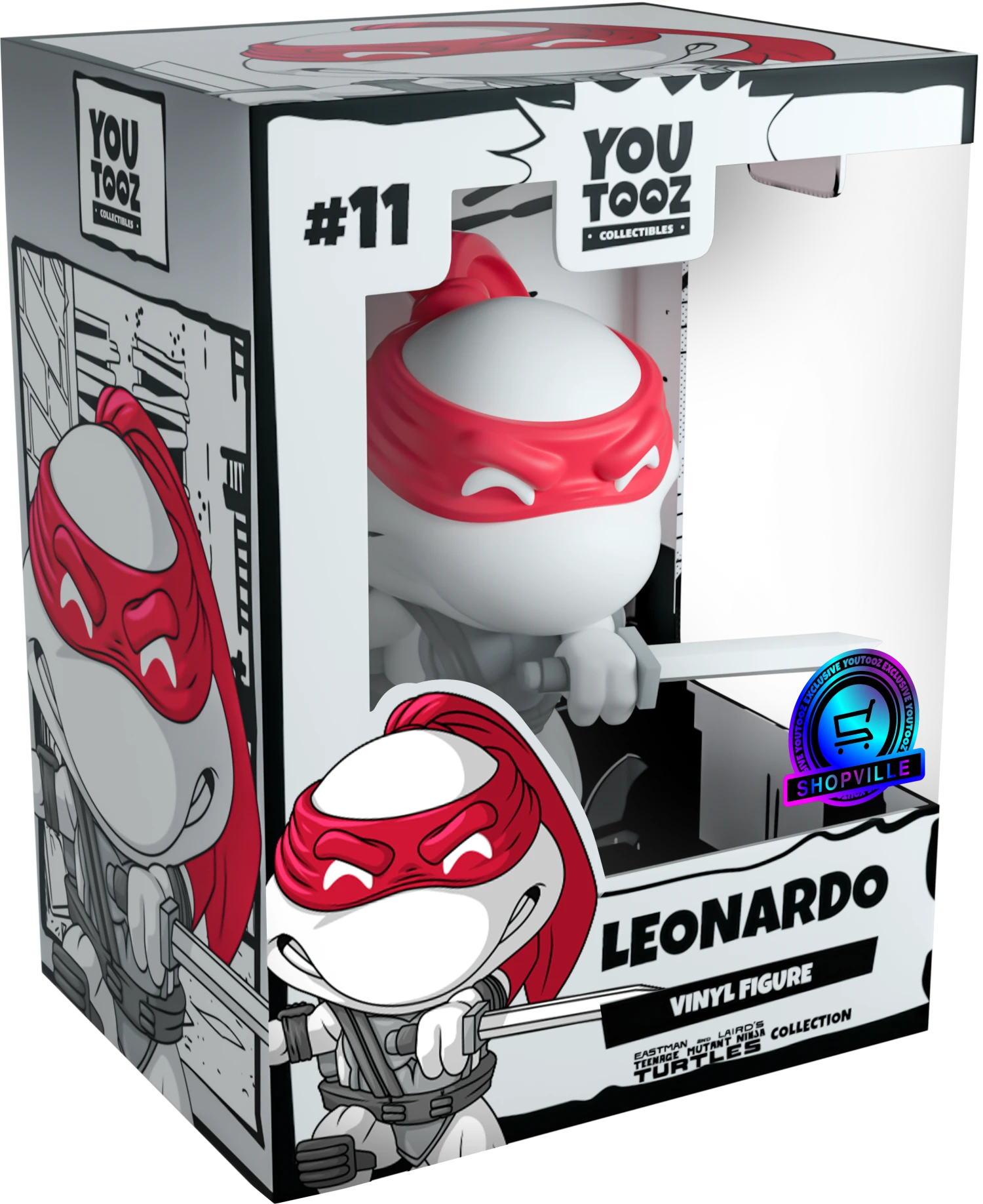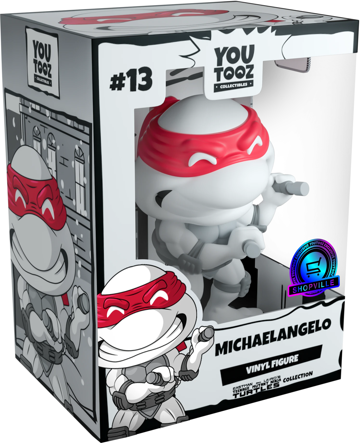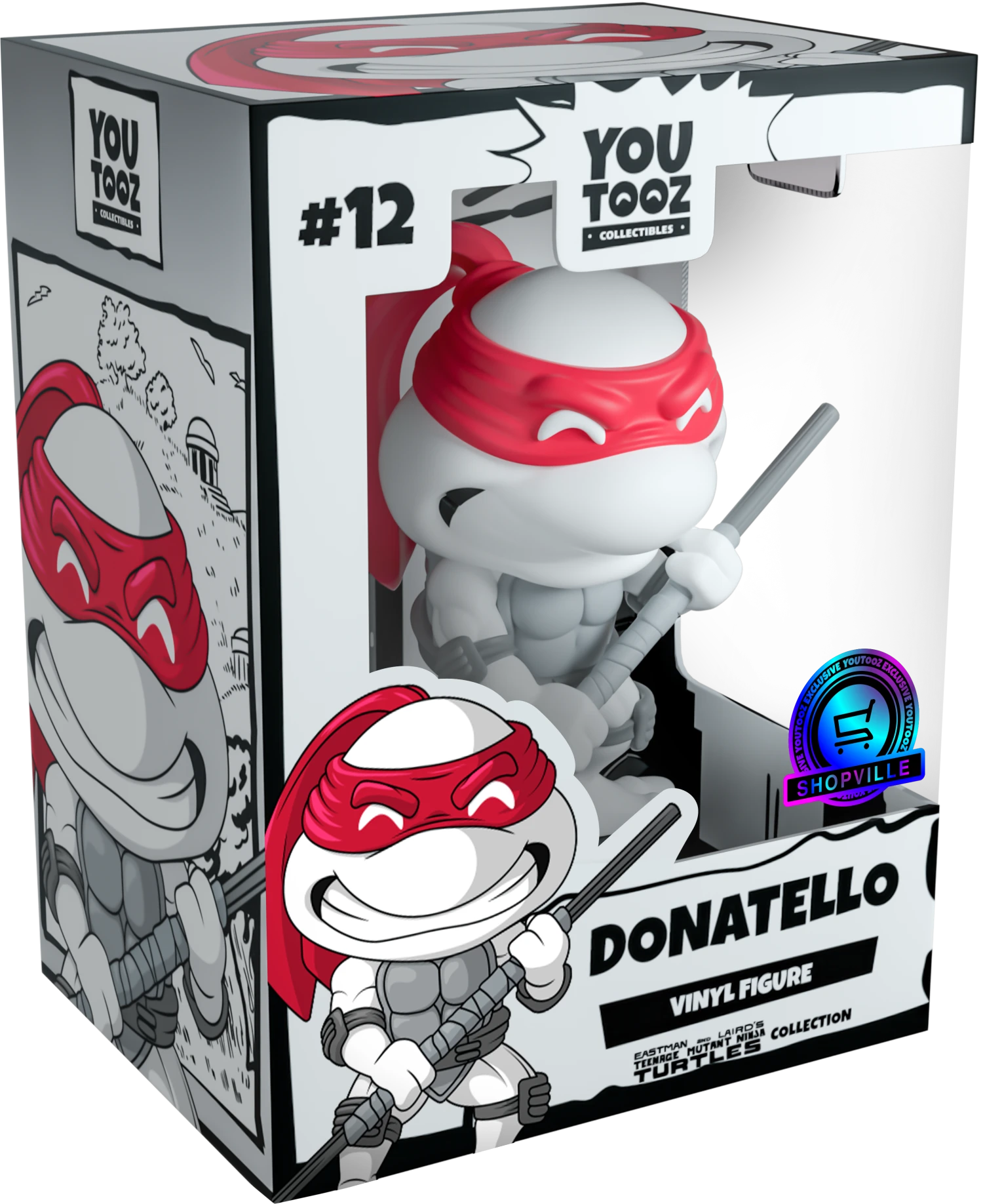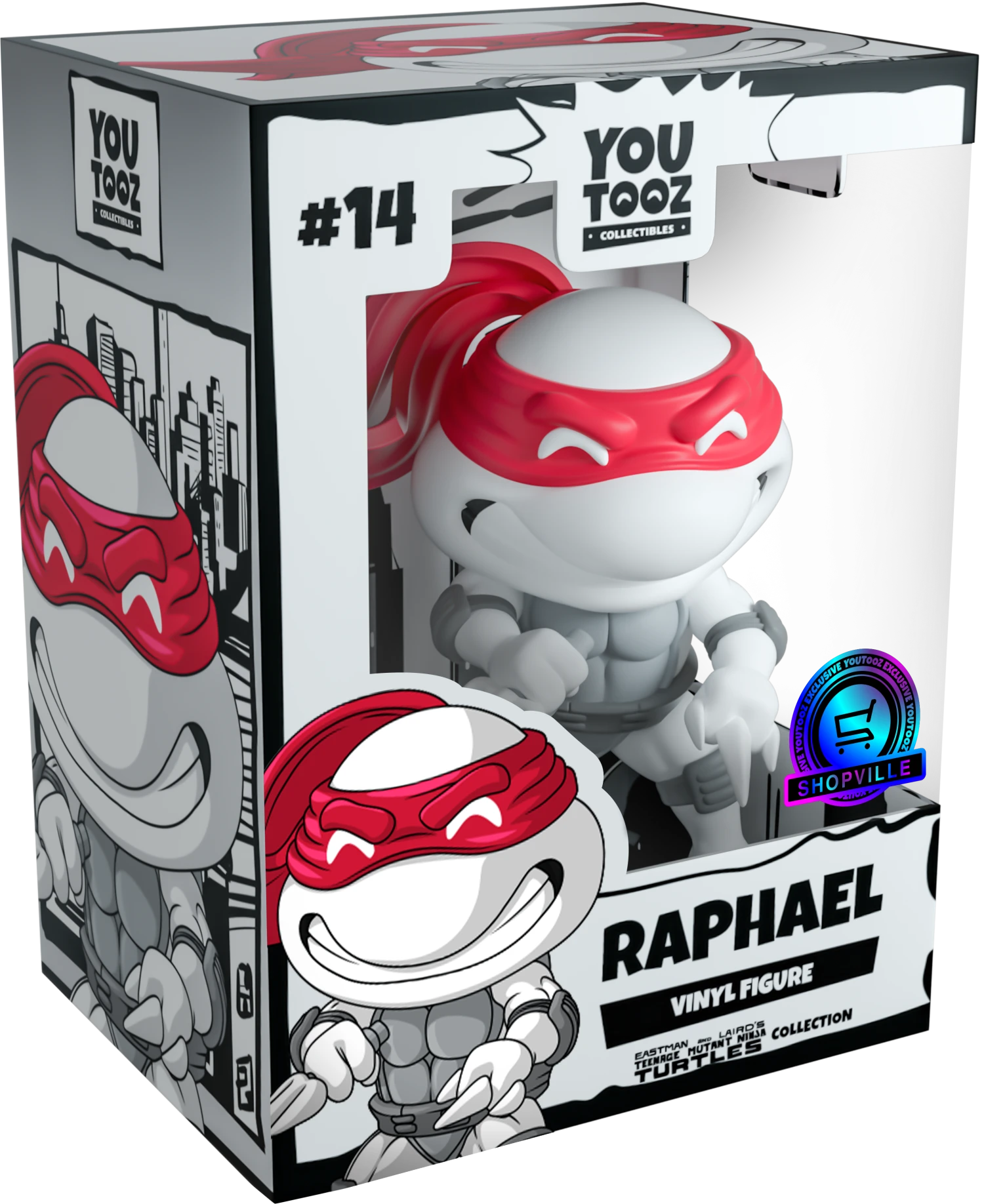 The Turtles return to Youtooz but this time in the most stunning black and grey palette with a vibrant contrast of color popping from the red mask tied around their faces. Each is posed ready for combat, bearing their teeth and brandishing their signature weapons clenched tightly in each hand as they ready themselves to unleash a devastating final blow. Dressed for battle, they wear protective guards strapped over their elbows and knees as well as a thick belt wrapped around their waist and dark grey shell. The exterior of their packaging sees four different beautifully illustrated scenes which evoke the distinct personalities of each turtle. The interior is the silhouette of a city skyline reflecting off the lake at its front, while the protective packaging has them posing in front of a comic book-esque panel as their figures can be seen through the large clear window at the front of each box. These collectibles ship in matte, embossed, protective outer sleeves and custom sized plastic protectors for maximum protection during shipping.