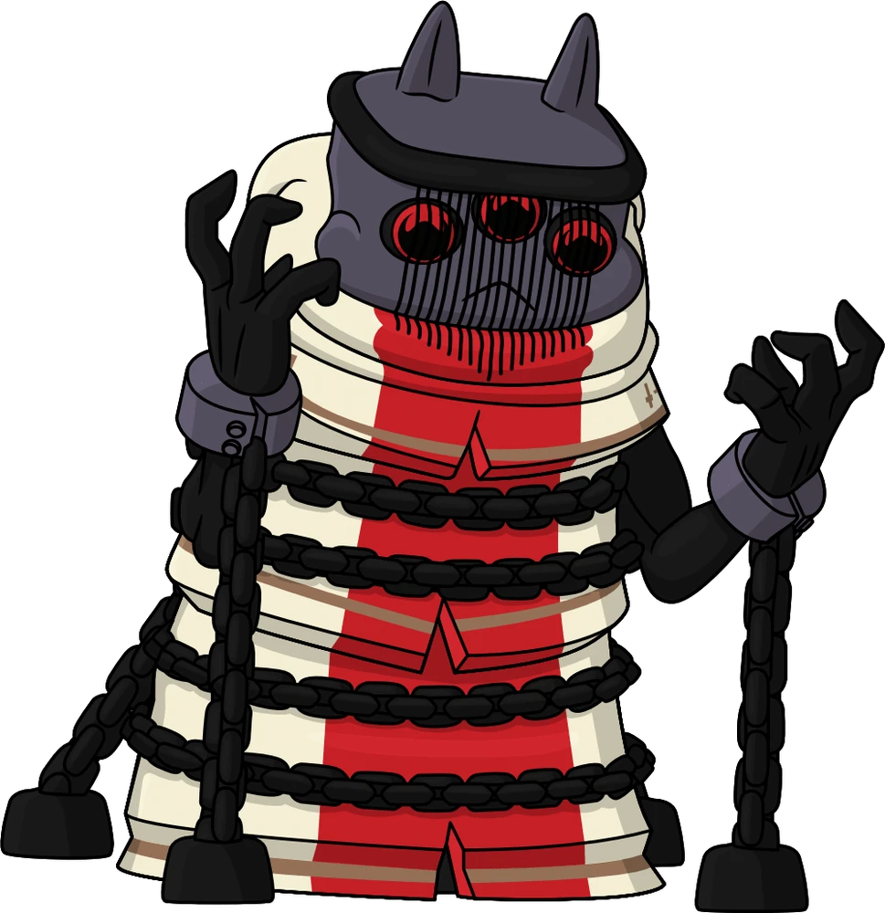 Standing at 4.4 inches tall draped in thick white robes with a large red streak cascading over his body, his spindly black hands are raised upward and shackled at the wrists with chains fixing them to the ground. With sharp pointed ears and a black band around his head, his sullen face stares downwards with a trio of glowing red eyes as a series of black chains wrap around his body to restrain him. The exterior of his packaging sees a solitary pentagram etched into the ground. While the interior is a vibrant blood splatter littered with symbols over an off-white background. The protective sleeve continues this off-white, with crosses and chains affixed to the ground and being pulled into the sky as his figure can be seen through the large clear window at the packagings front. This collectible ships in a matte, embossed, protective outer sleeve and a custom-sized plastic protector for maximum protection during shipping.