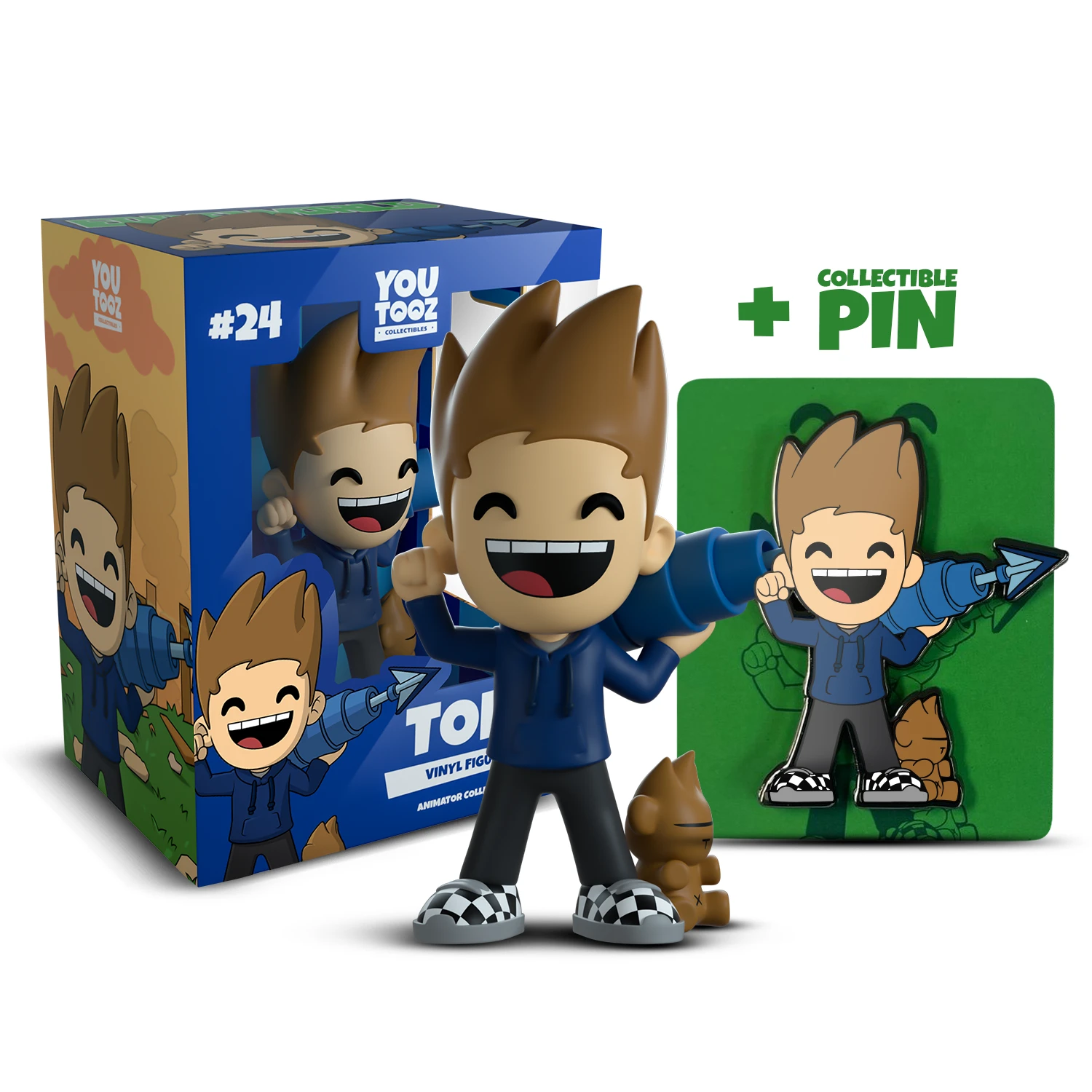 Tom is here to make his Youtooz debut and to do someuhhfishing? Standing at 5.3 inches tall and slinging the tubular body of a harpoon gun over his left shoulder as its sharp end is pointed outwards, a huge smile stretches across his overjoyed face as his long brown hair spikes up high. Raising up a fist victoriously, he wears a simple blue hoodie, grey and pants and checkered black and white shoes as a small brown Tomee Bear sits at his feet. The exterior of his packaging sees the destroyed, smoking remains of a house in front of an orange sky. While the interior is checkered in blue squares and the protective sleeve is decorated with diagonal blue stripes, as his figure can be seen through the large clear window at the packagings front. This collectible was designed in collaboration with community member@therealracckunand ships in a matte, embossed, protective outer sleeve and a custom-sized plastic protector for maximum protection during shipping.
