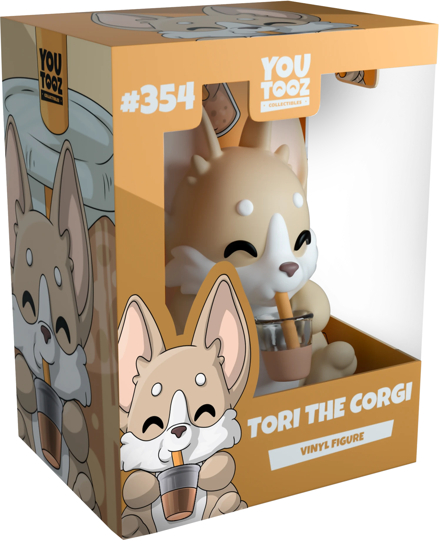 Meet Tori, a super cute and energetic corgi who loves making friends! Sitting at 4.3 inches, Tori has an extremely content look on her face with her ears perked straight up to the sky. With both of her hands she is holding a transparent cup that has some bubble tea inside of it. The orange straw that she is drinking out of is making a small bump on the left side of her cheek. Her two paws float in front of her with her cute white belly exposed underneath her drink. The exterior of her double-walled packaging is a very calming and cozy living room with Tori and her friend Samuel sitting on the floor, playing with their other friends. The interior is a light orange background with a pattern of bubble tea going across. This collectible ships in a matte, embossed, protective outer sleeve and a custom sized plastic protector for maximum protection during shipping.