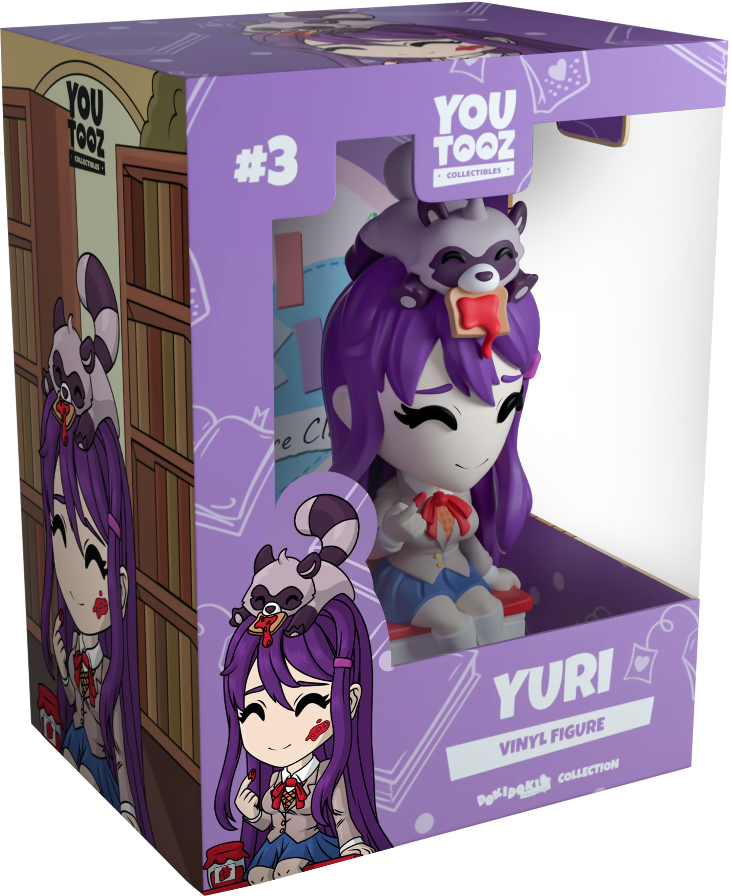 After all, doesn’t a hot cup of tea help you enjoy a good book? Yuri has finished her book and made her way into Youtooz! Designed in collaboration with ItsGrilledPasta shes posed sitting perched atop a red covered book next to a jam jar and sits 4.6 inches tall. A jam-covered finger is held up to her unassuming red smeared face while the cutest raccoon stretches itself out on top of her head and holds a slice of dripping toast in its mouth. Her deep purple hair falls effortlessly down her back onto the book shes seated on and covers a perfectly kept uniform, its light brown blazer covers a brown vest and tops a blue pleated skirt and knee high white socks. The exterior of her packaging has her sitting amongst the tall bookshelves of a library as the warm afternoon light shines in. While the interior is a pale purple background patterned with illustrations of books and tea bags. The protective sleeve sees Yuri taking a break from her book to peer out the window and take in the blooming purple and white flowers outside. This collectable ships in a matte, embossed, protective outer sleeve and a custom sized plastic protector for maximum protection during shipping. This figure was made in collaboration with community member@ItsGrilledPasta